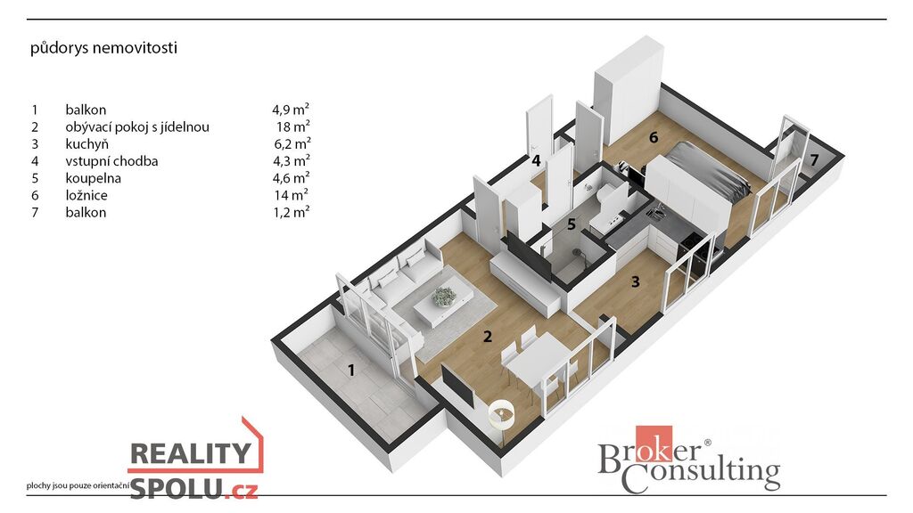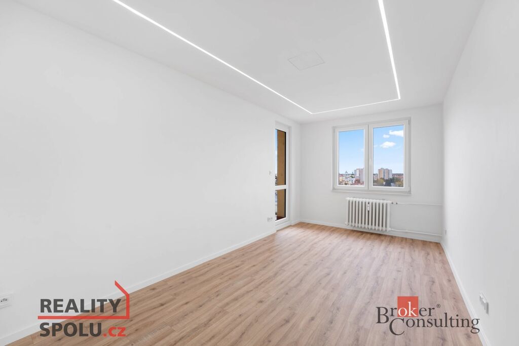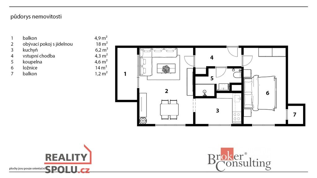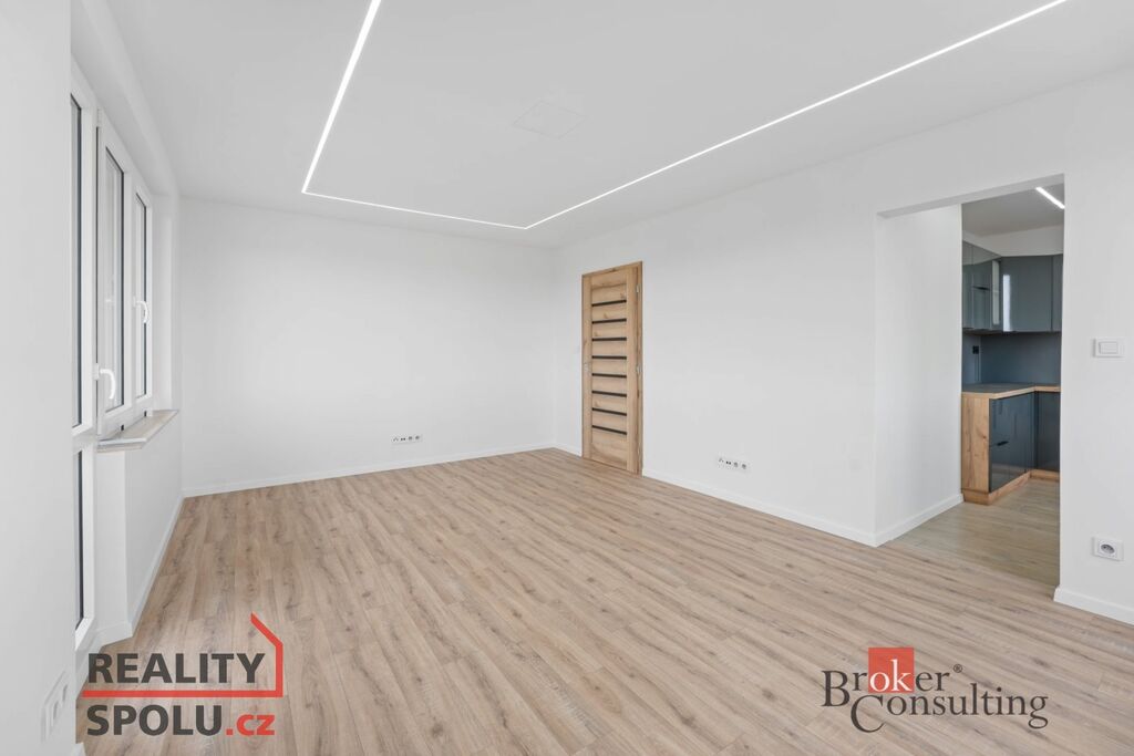 Dispozice: vstupní chodba, obývací pokoj se vstupem na balkon, kuchyně, koupelna s WC a samostatný pokoj se vstupem na druhý balkon.
