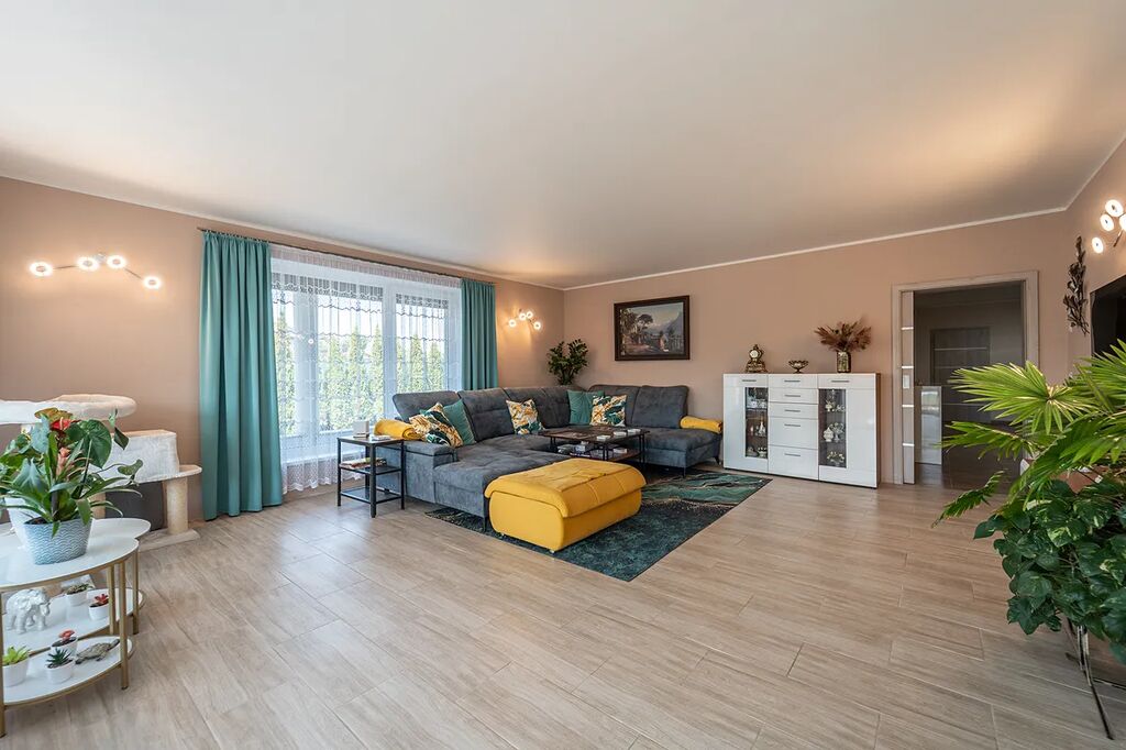 Dům je cihlový (Porotherm) a zateplený (40+10). V domě se nachází prostorná hala se světlovody, které do domu přivádí denní světlo zvenku. Dále pak dispozici tvoří kuchyně s velkým jídelním prostorem, obývací pokoj s velkoformátovými okny, ze kterého je přímý vstup na terasu a zahradu se zapuštěným nevytápěným bazénem 1,5x3x5m. Dům disponuje třemi neprůchozími pokoji, praktickou šatnou a dvěma koupelnami. Jedna koupelna je s vanou a druhá se sprchovým koutem a vstupem na menší terasu s posezením a orientací na východ. Na halu navazuje chodbička do další místnosti, kterou lze využít jako obývací místnost nebo pracovnu, a do technické místnosti, kde se nachází tepelné čerpadlo, zásobník teplé vody, pračka, sušička apod., dále je zde vstup do garáže. V zadní části domu se nachází hlavní vstup do domu a chodbička, ze které vede výsuvný žebřík na pochozí půdu. Dům má okna-trojskla (AR Okenní technika).