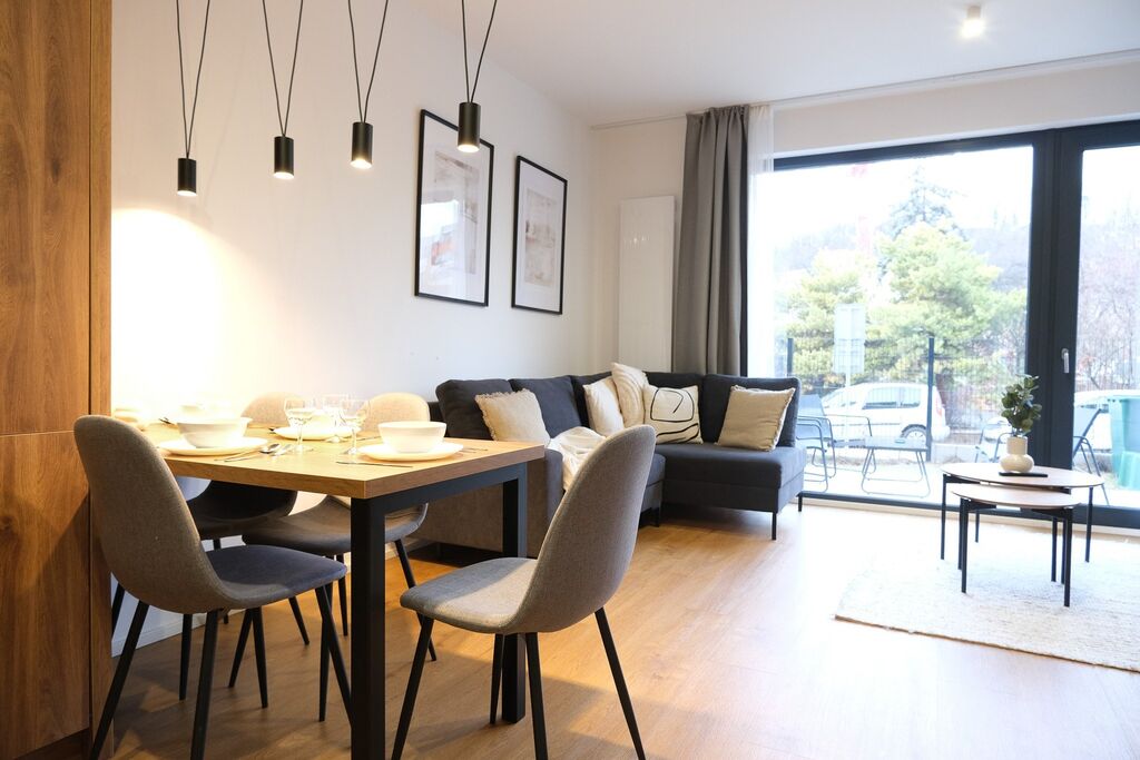Byt s dispozicí 1 ložnice a 1 obývací pokoj s kuchyní, je plně vybaven nábytkem ve skandinávském stylu a základními spotřebiči, má prostornou předzahrádku/terasu (33m2) a je možné ho koupit buď pro sebe, jako investici (je možné dokonce pokračovat s krátkodobým pronájmem, kde má byt již vybudovanou delší historii s vysokým hodnocením a kladnými referencí).