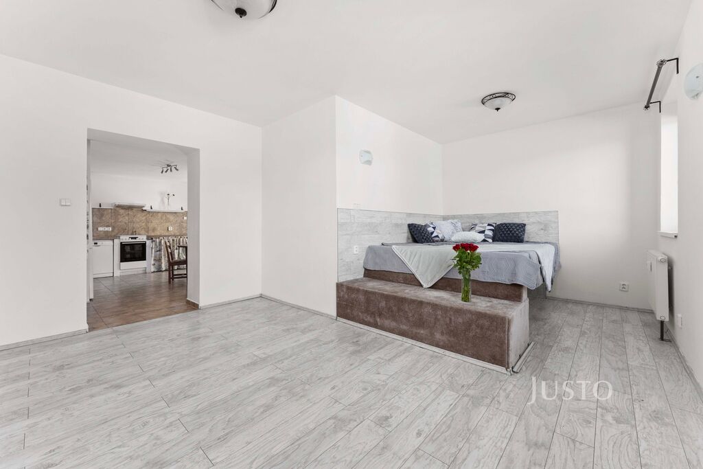Byt je částečně vybavený, v kuchyni jsou elektrospotřebiče - pračka, myčka, sušička, elektrická varná deska, lednice.