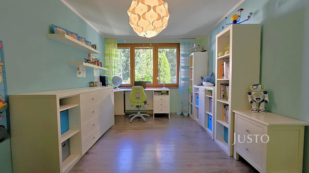 V 1. patře se nachází hlavní obytná část domu. Kuchyně s jídelnou (17 m² ) je laděna do stylu Provence. Dominantou obývacího pokoje (35,1 m²) jsou stylová krbová kamna a otevřená galerie.  Z obývacího pokoje lze vyjít přímo na terasu (9,3 m²), dále do zahrady, mj. s pergolou. Dále jsou zde umístěny  ložnice (22,4 m²)a  dětský pokoj (13,4 m²).  Koupelna s vanou, sprchovým koutem a WC (7,1 m²) je zajištěna přímým odvětráním a denním světlem.