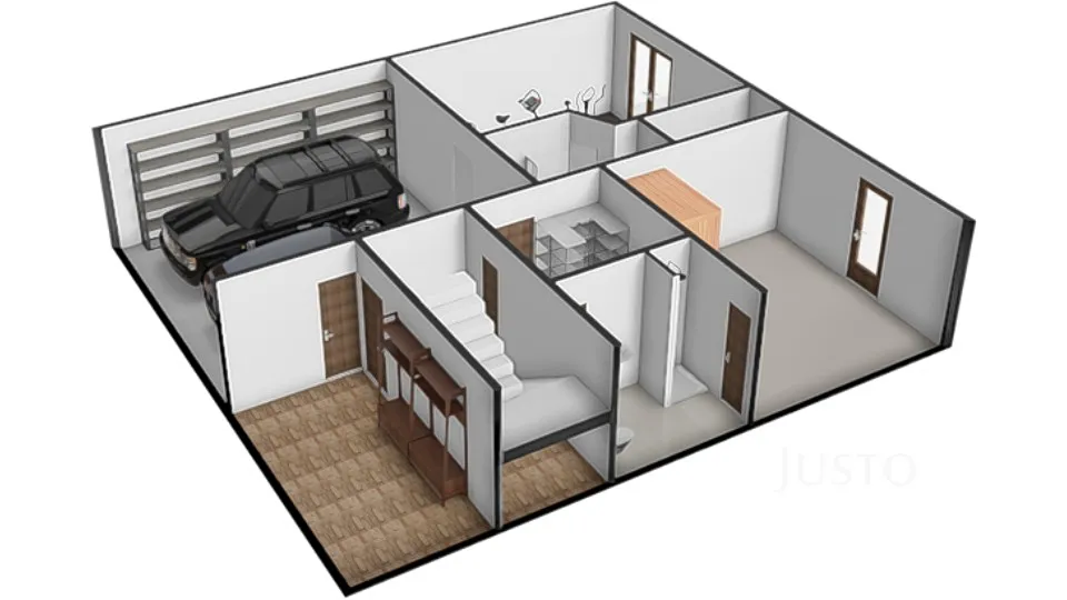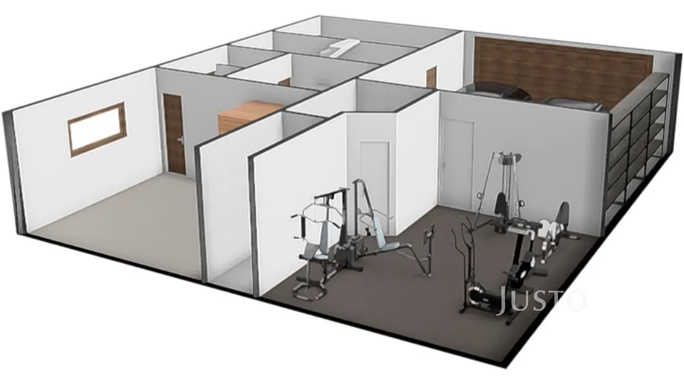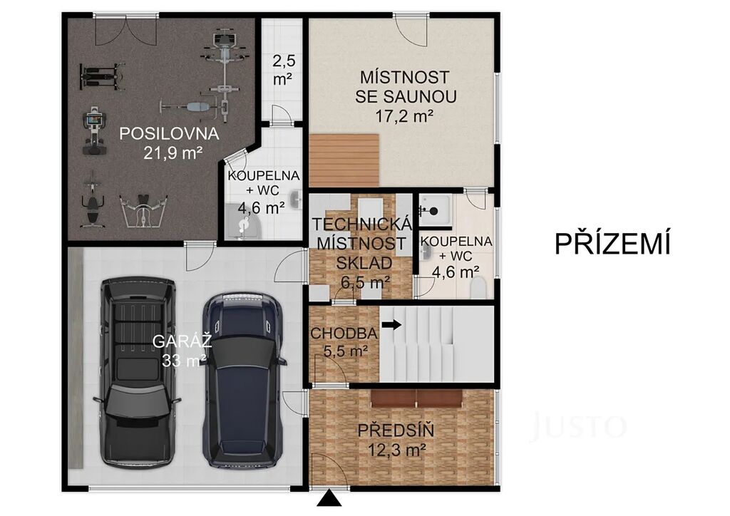 V přízemí se nachází velkorysá vstupní hala (12,3 m²), dodává celému interiéru vzdušný ráz. Hala navazuje přímo na garáž (33 m²)pro dva osobní vozy. K dalšímu ev. parkování poslouží  zpevněná plocha před garáží. Další části přízemí je posilovna (21,9 m²), místnost se saunou (17,2 m²), která je s vlastním sprchovým koutem a toaletou. Z obou těchto místností lze vyjít na zahradu s bazénem. Místnost se saunou by bylo možné upravit k trvalému bydlení nebo případně k využití pro drobné podnikání. Technická místnost (6,5 m²) tč. slouží jako spíž a úložné prostory.
