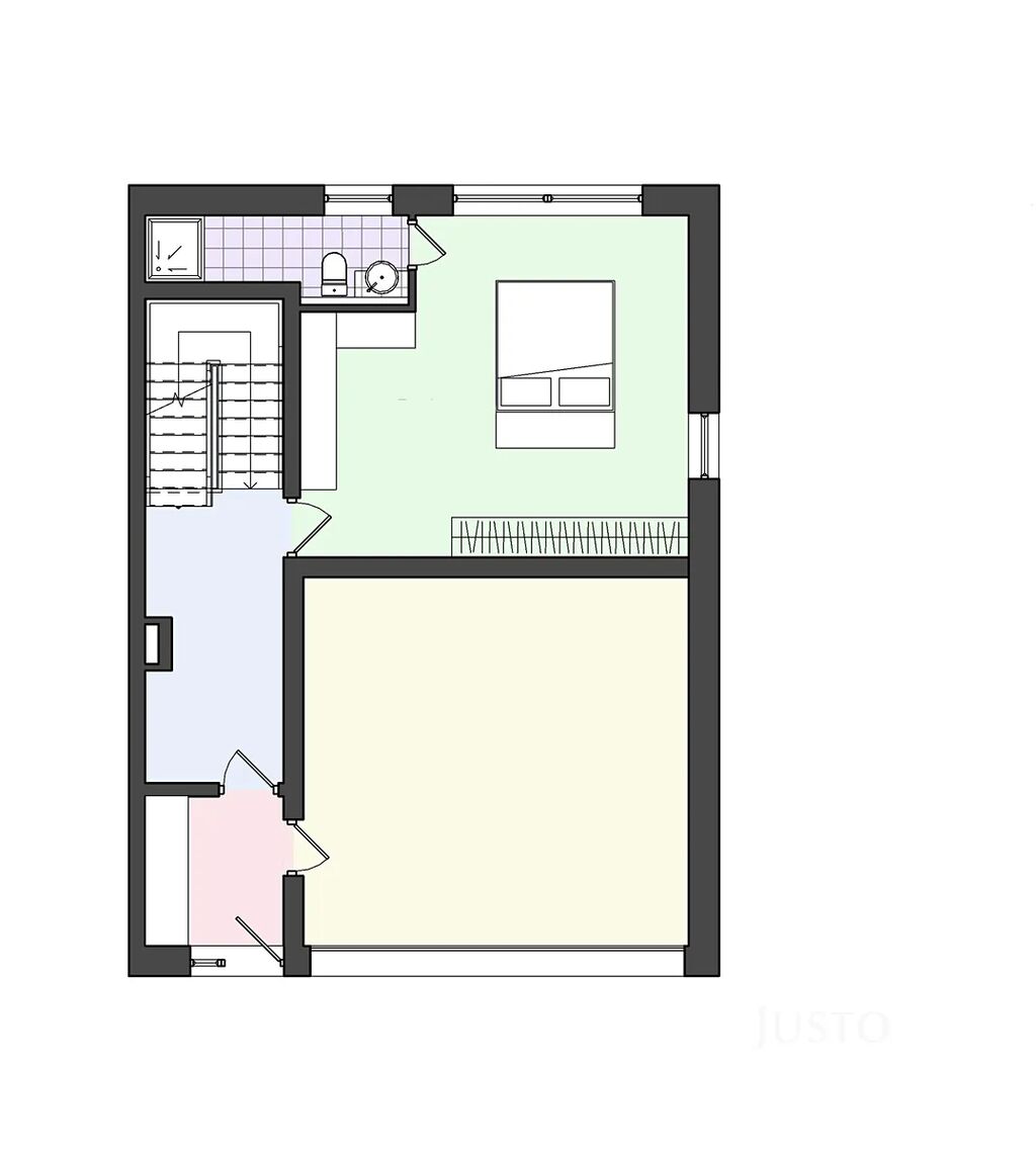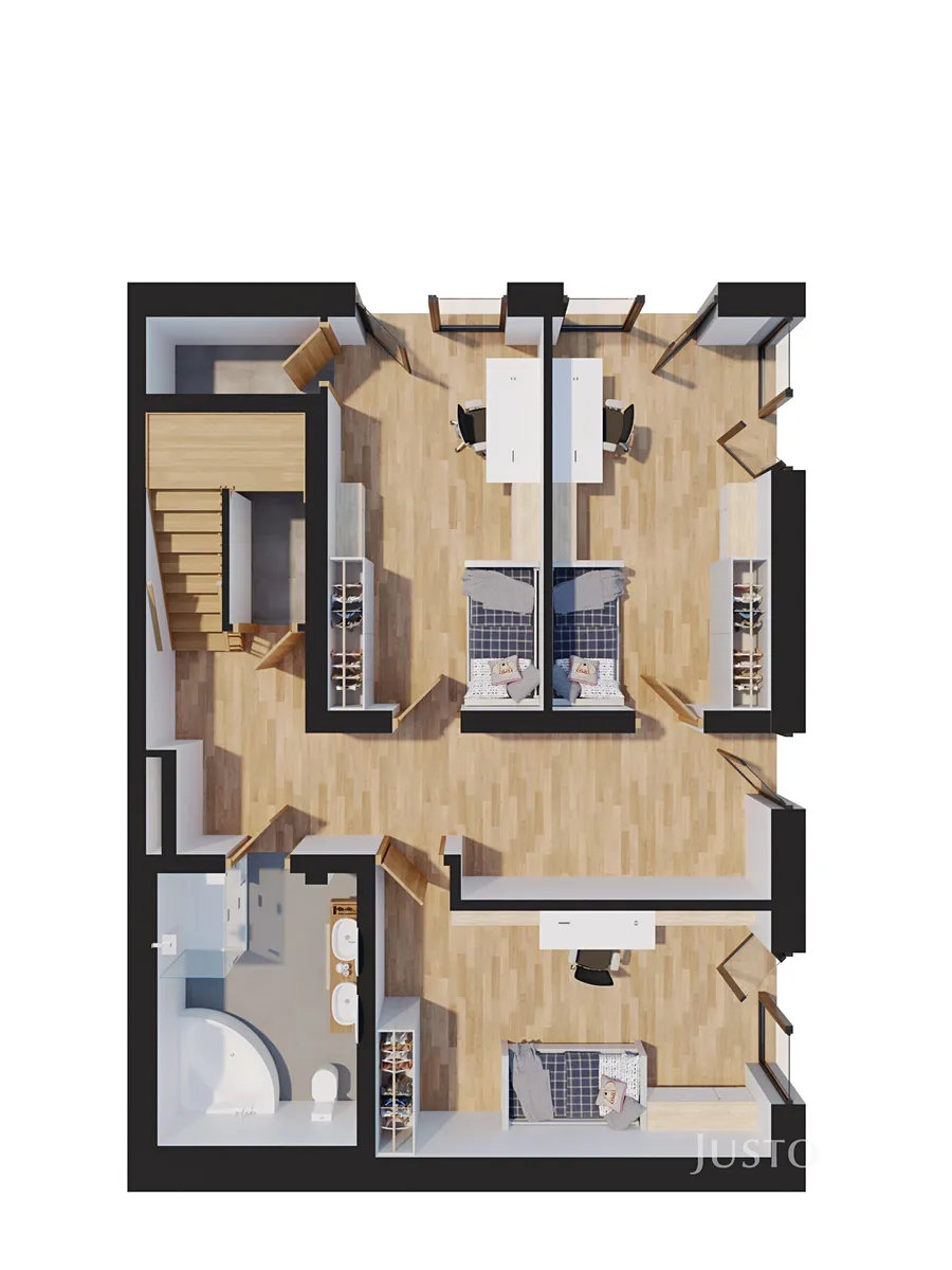 Dispozice 5+kk je řešena velmi prakticky s důrazem na soukromí a pohodlí: