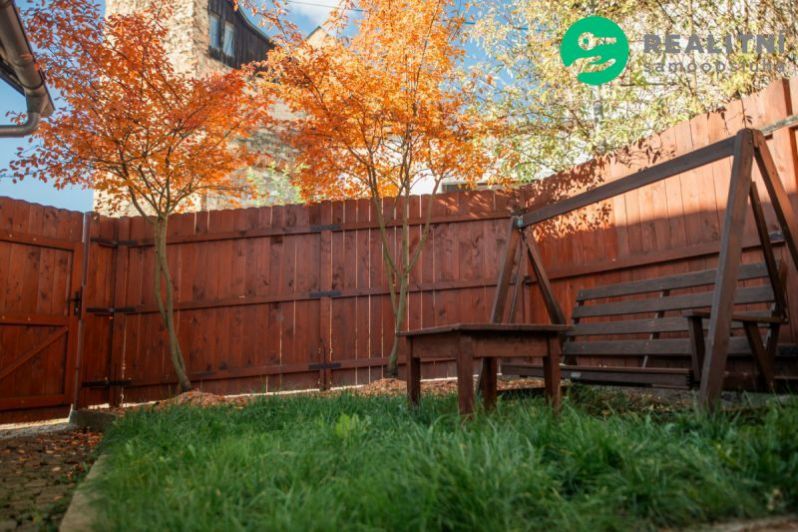 K domu patří také malý dvorek s posezením, obklopený krásným modřínovým plotem, který poskytuje nečekané soukromí v samém centru města.