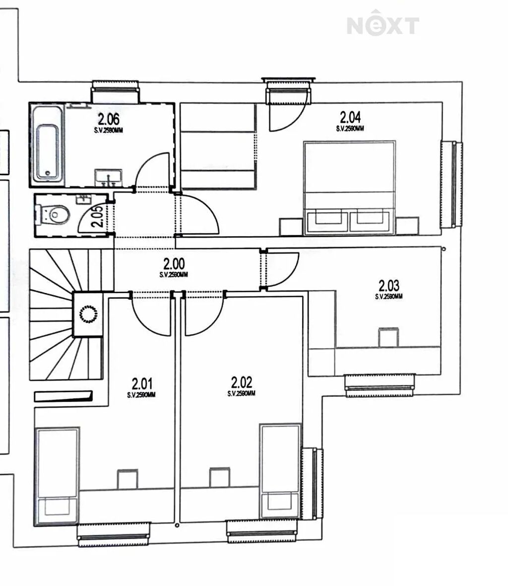 V patře jsou čtyři pokoje, koupelna a další samostatné WC.