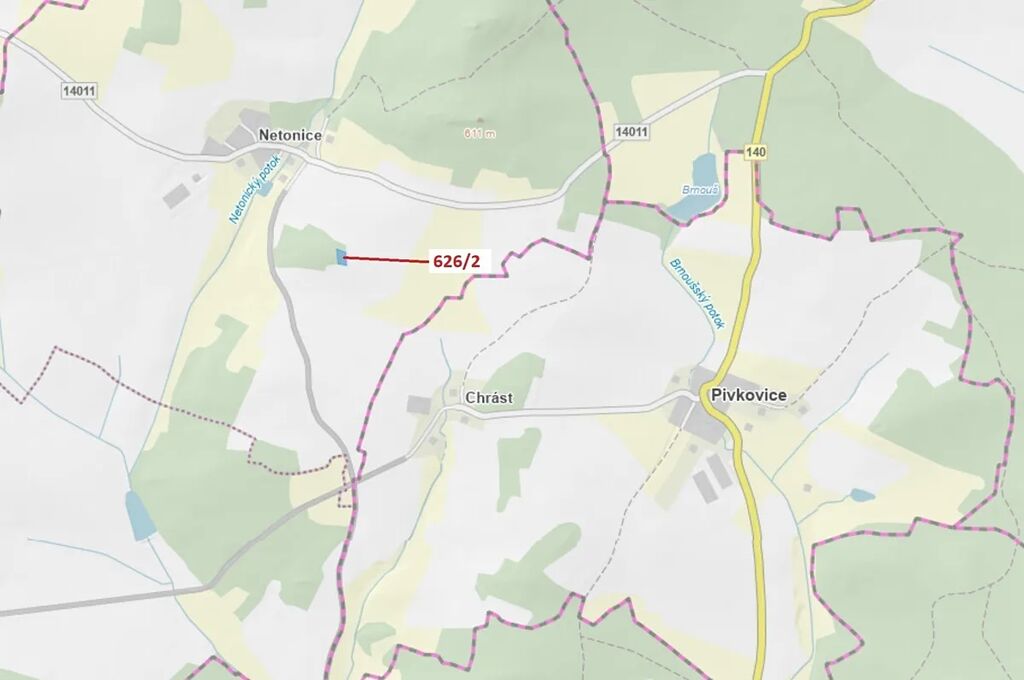Lesní pozemek o výměře 1522 m2, parcelní číslo 626/2, podíl 1/1, katastrální území Netonice, obec Bílsko, obec s rozšířenou působností Vodňany, okres Strakonice, Jihočeský kraj. Po těžbě.