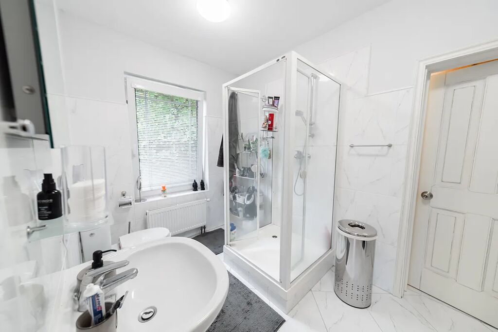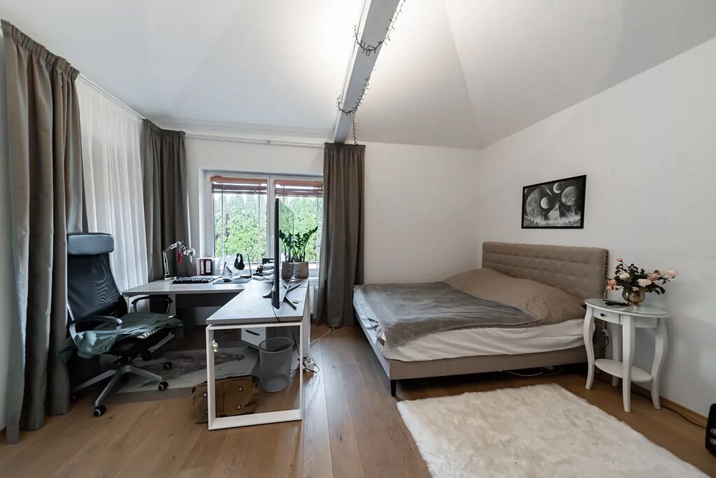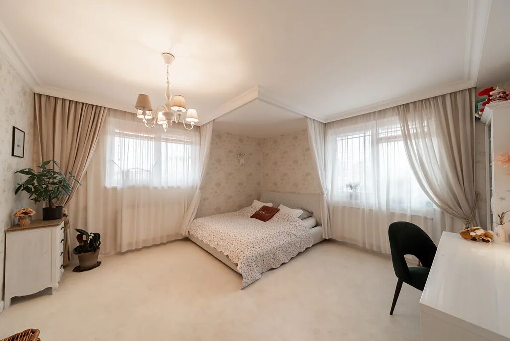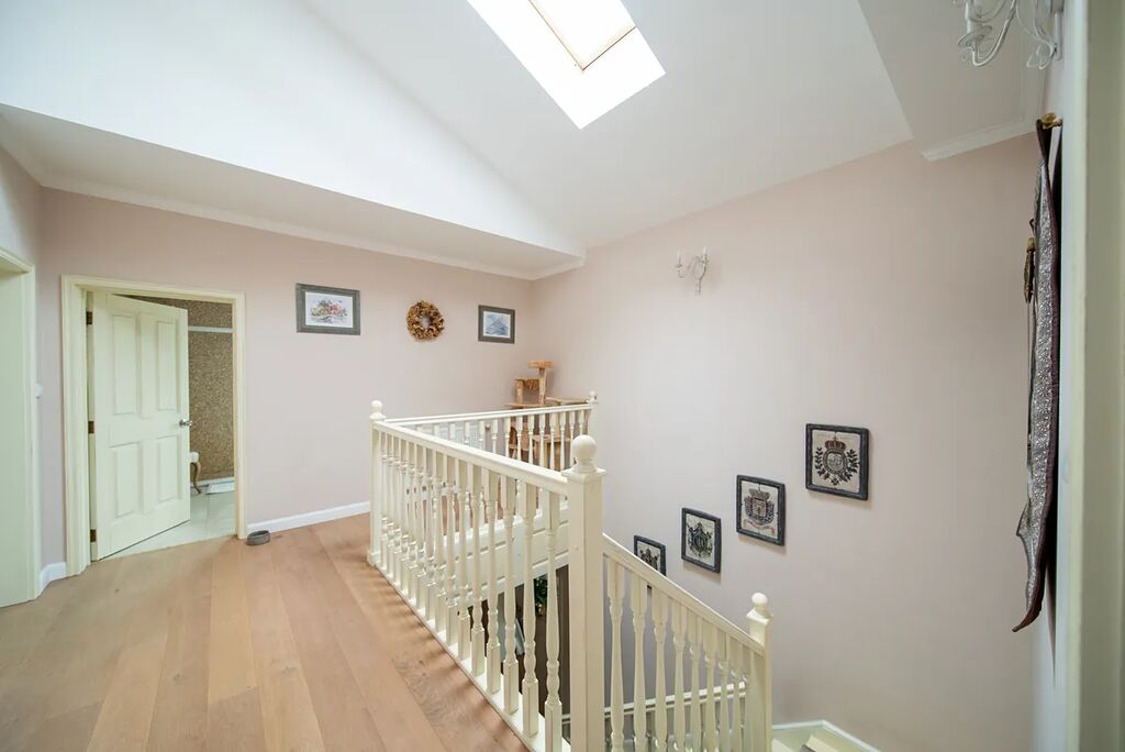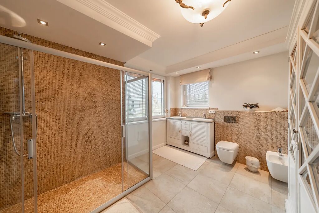 V patře se nacházejí dvě ložnice. Jedna z nich je rozdělena na obytnou část, pracovnu a šatnu, druhá slouží jako dětský pokoj a má vlastní šatnu. Prostorná koupelna na patře je vybavena sprchovým koutem, bidetem, toaletou a dvěma umyvadly.