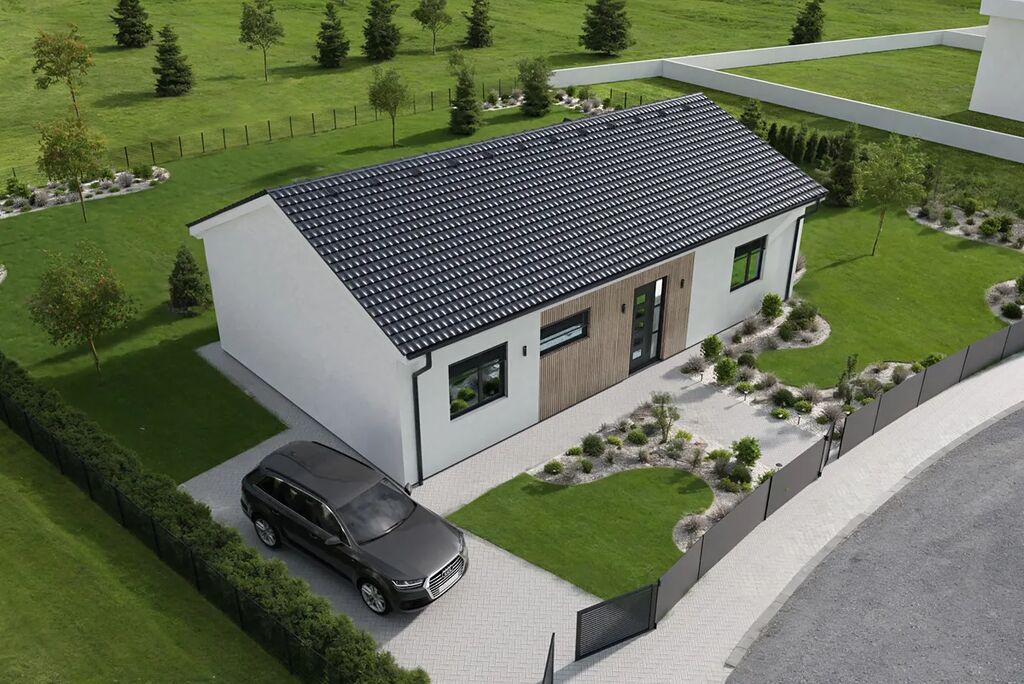 Cena domu obsahuje také příjezdovou komunikaci včetně chodníku, přípravu na klimatizace, přípravu na fotovoltaiku, přípravu pro pokládku finální terasy a napojení na inženýrské sítě včetně retenční nádrže.
