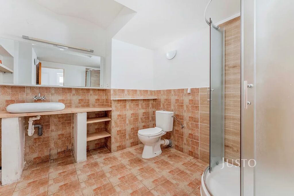 V prostorné koupelně je umyvadlo, WC a sprchový kout.