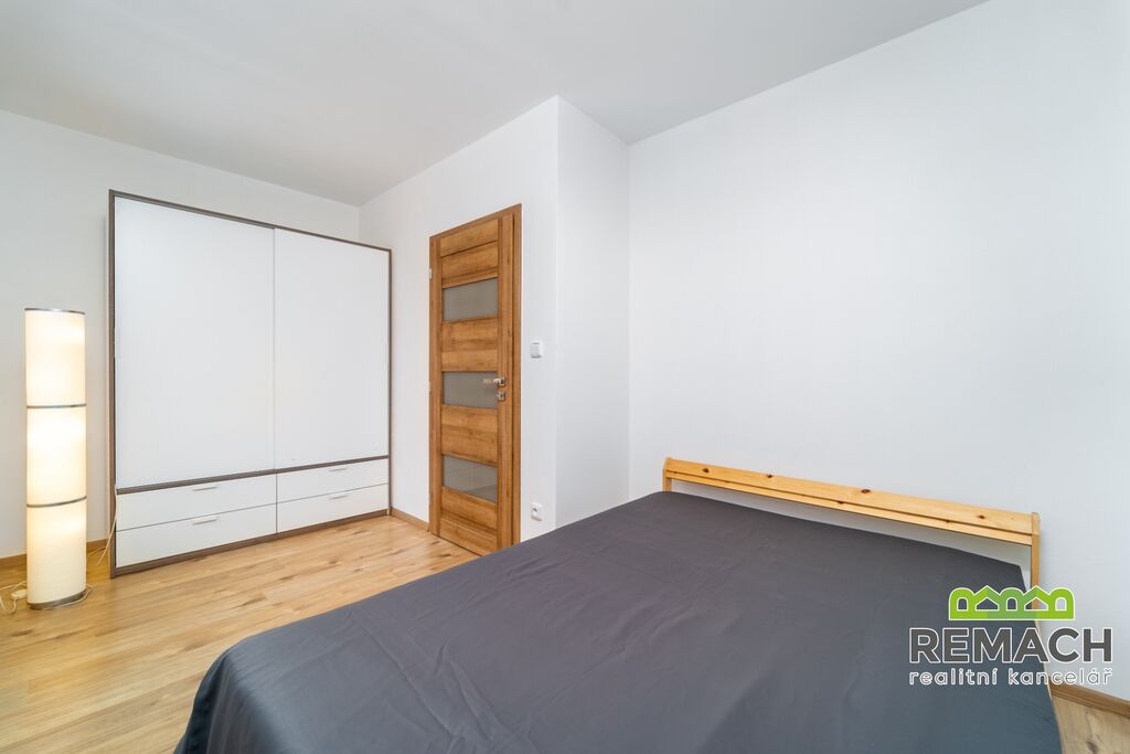 Dispozice nabízí prostorný a světlý obývací pokoj s kuchyňským koutem, dvě ložnice a koupelnu. K bytu náleží terasa o velikosti 20 m², vlastní parkovací stání a garáž, které oceníte zejména v zimních měsících.