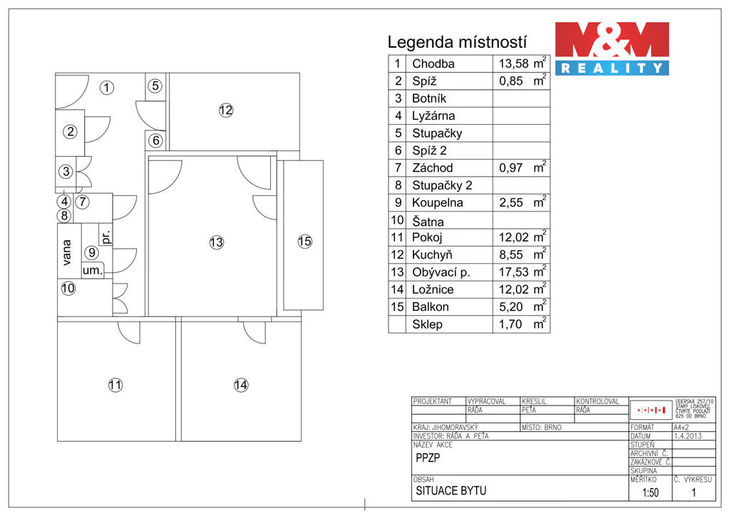 Prodej bytu 3+1, Brno, Sevastopolská, 77 m2