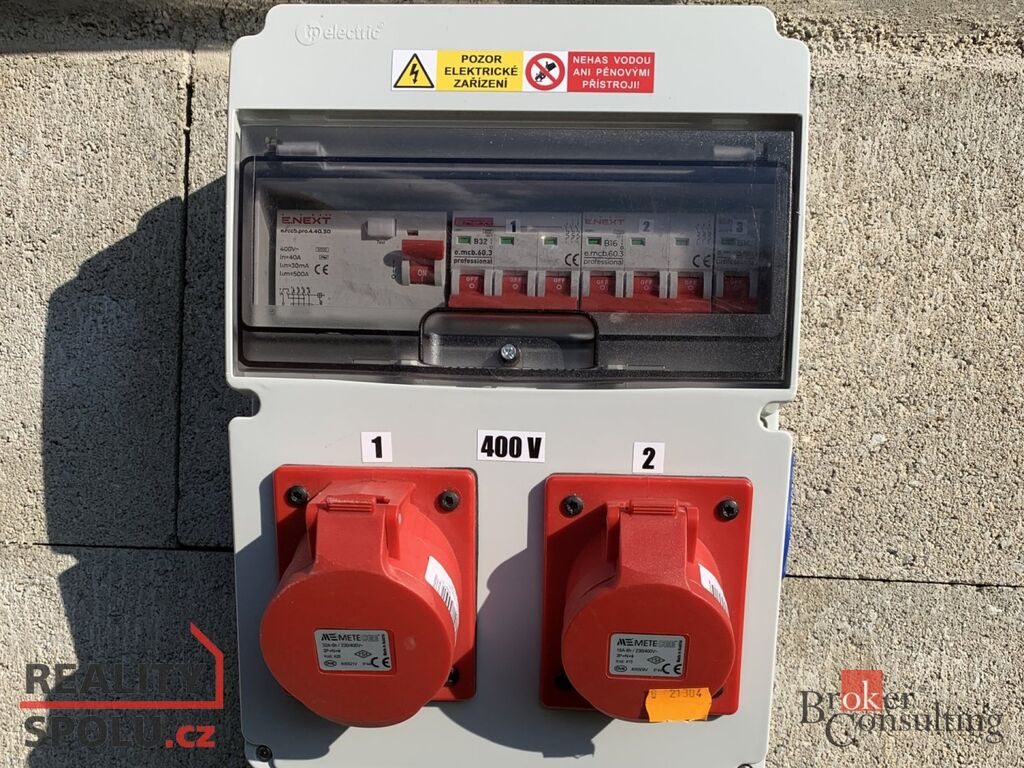 Pozemek je napojen na síť elektrické energie od ČEZ (jističe 3 × 32 A, kategorie C) což umožňuje