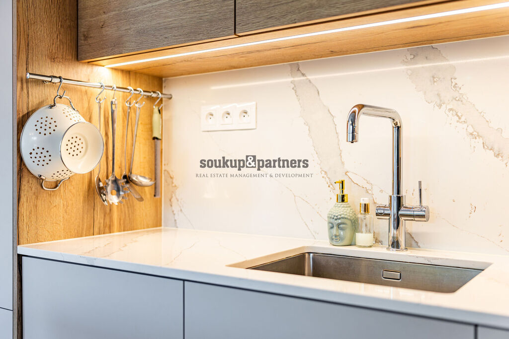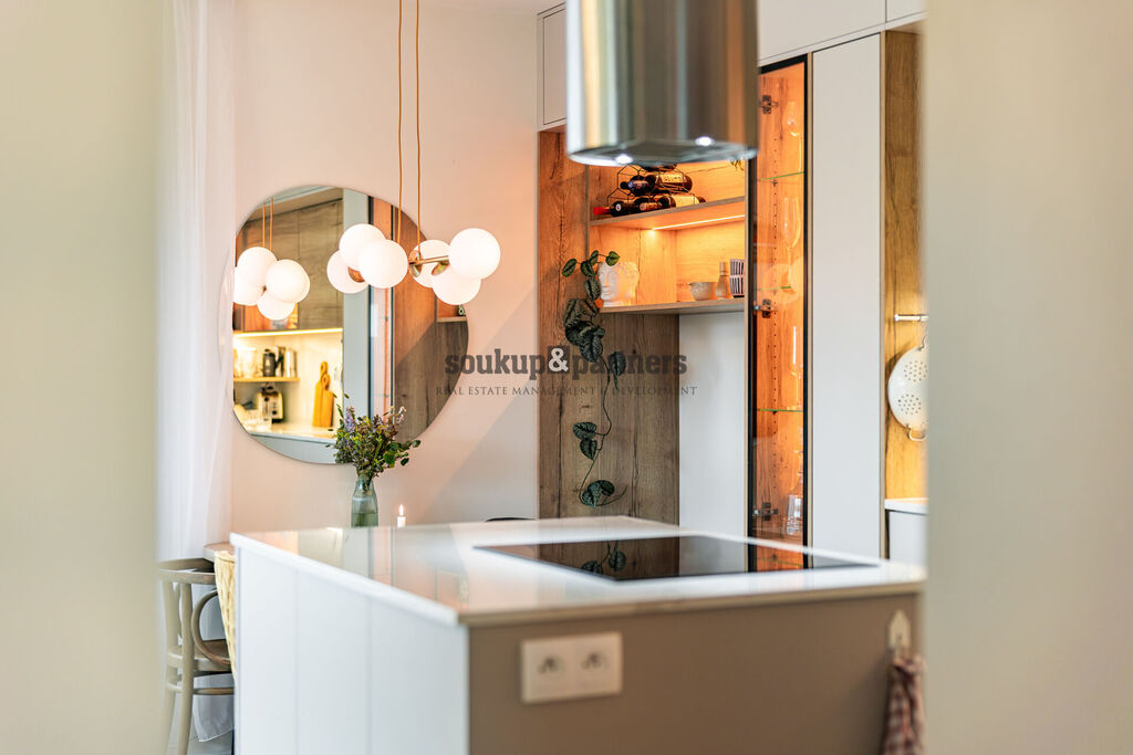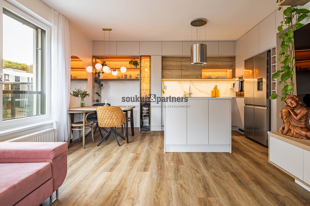 Jednotka je orientována na jihovýchod a nabízí nadstandardní, designově sladěné vybavení. Kuchyňská linka byla vyrobena na míru a osazena pracovní deskou Technistone, přičemž kuchyňský ostrůvek má samostatně přivedenou elektrickou přípojku pro maximální komfort při vaření i stolování. Součástí vybavení je americká lednice, vinotéka, LED podsvícení vestavěného nábytku a systém chytrého osvětlení Philips HUE. Interiér doplňují kvalitní interiérové dveře včetně obložení značky Sapelli, bezpečnostní vstupní dveře a videotelefon. O komfort se starají elektrické venkovní žaluzie a plisované sítě proti hmyzu.