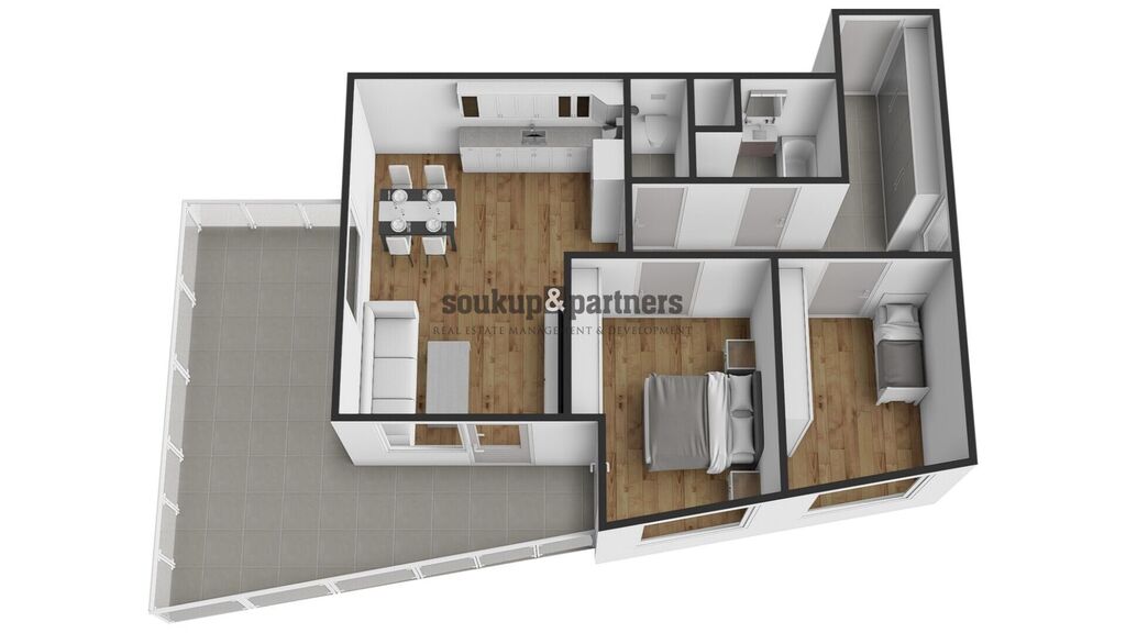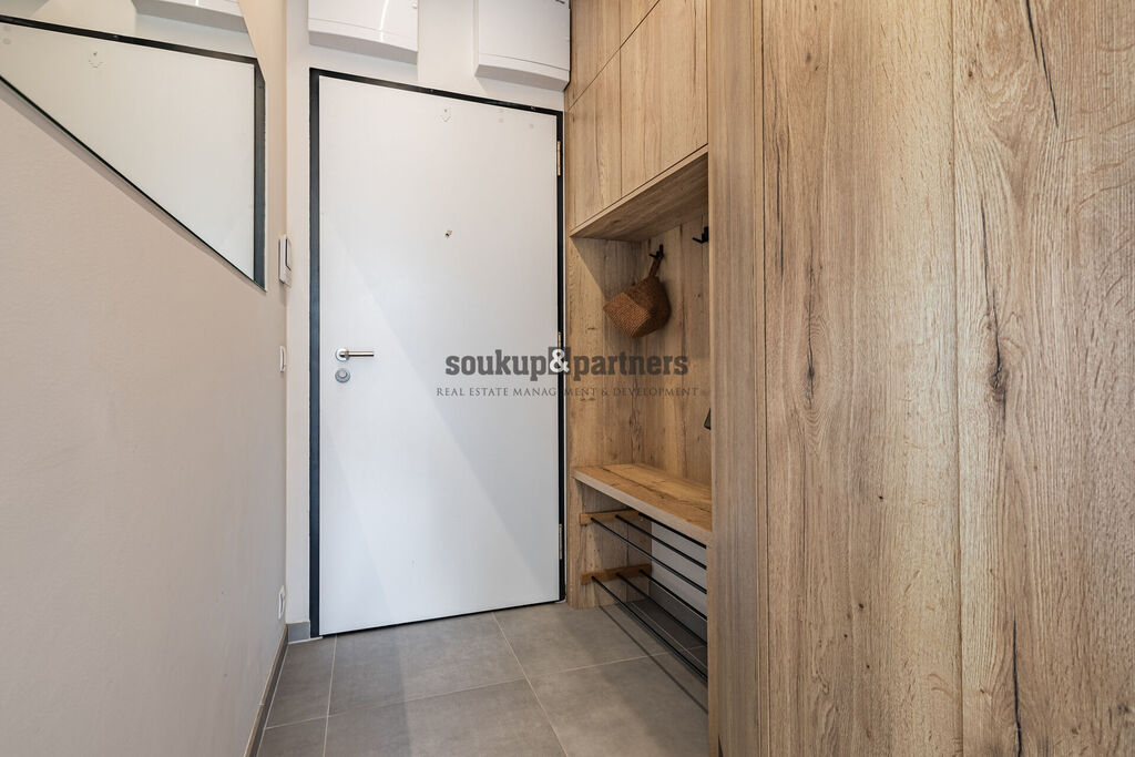 Velkým benefitem je prostorná terasa, která nabízí vysoký standard venkovního zázemí – najdete zde velkoformátovou dlažbu, skleněné zábradlí, elektrickou markýzu, osvětlení a přívod vody přes nezámrzný kohout. K bytu dále náleží garážové stání a sklep – vše je již zahrnuto v ceně.