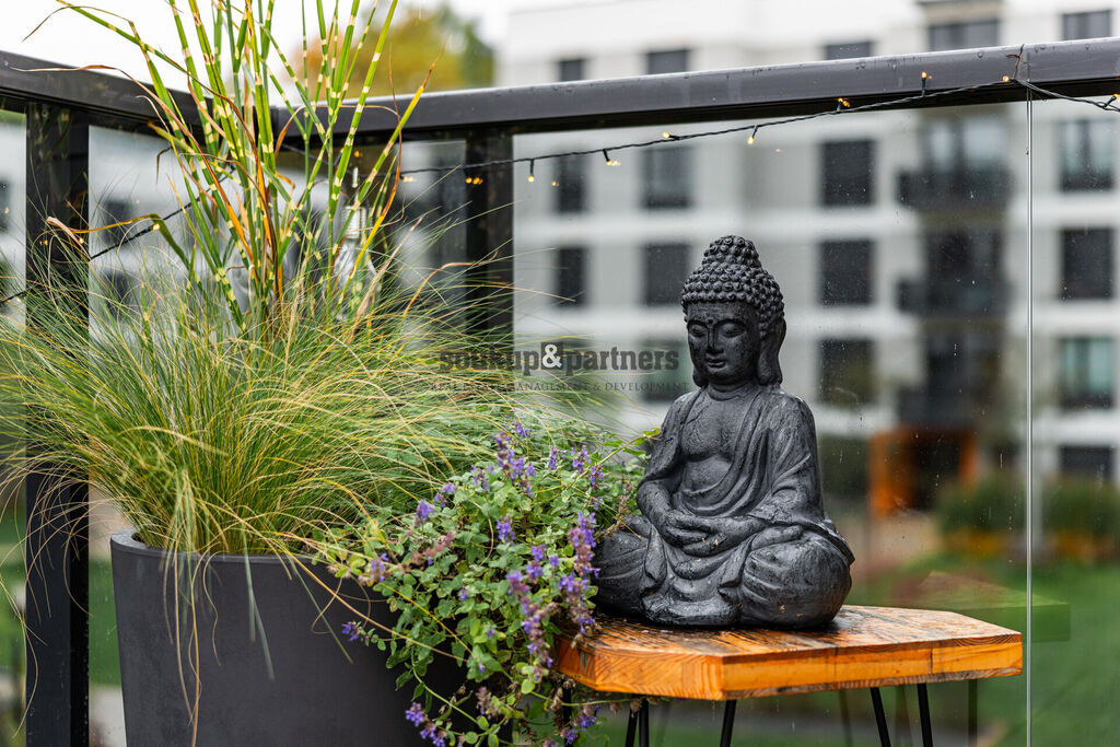 Byt je umístěn v rámci uzavřeného areálu, který zajišťuje vyšší úroveň bezpečnosti díky kamerovému systému, oplocení, vjezdové bráně a také recepci u vstupu do objektu. Celý projekt je navržen s ohledem na energetickou efektivitu a udržitelnost – vybaven je fotovoltaickými panely pro snížení nákladů na provoz společných prostor, retenčními nádobami pro svod dešťové vody a nádobami na bioodpad, což odráží moderní a ekologický přístup k bydlení.