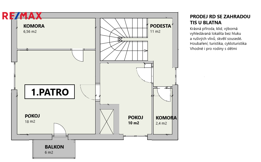 V přízemí je kuchyň, pokoj a pracovní prostor ze kterého lze snadno lze vybudovat další pokoj. Dále WC , koupelna, 2 komomory V patře pak 2 pokoje, další dvě komory půda Z jednoho pokoje vstup na balkon