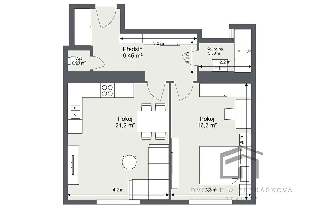 Byt nabízí vstupní předsíň, kde najdete prostor pro možnost vestavby skříní a samostatné WC. Dále vstup do koupelny a do dvou samostatných světlých pokojů se slušnou výměrou 20,9m2 a 16,1m2.