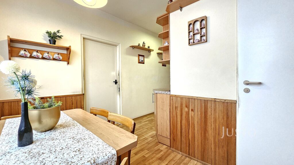 Dispozice bytu nabízí prostorný obývací pokoj (16,2 m²), dva samostatné pokoje (ložnice a dětský pokoj, každý 12,3 m²), kuchyň s jídelní částí (11,1 m²) a předsíň (5,6 m²) s praktickým úložným prostorem/komorou (2,1 m²). Byt je částečně vybaven a připraven k nastěhování či případné modernizaci dle vlastních představ. K bytu náleží sklep, což oceníte pro další možnosti uskladnění.