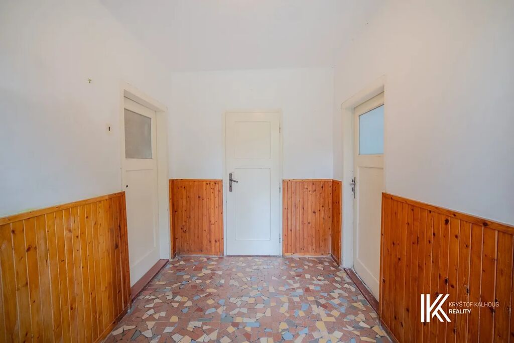 Hlavní dveře vás zavedou do chodby, odkud se vlevo vstupuje do kuchyně – prostorné místnosti s oknem do dvora. Kuchyň je dostatečně velká nejen pro kuchyňskou linku, ale i pro jídelní kout. V její zadní části kuchyně se nachází spíž, ideální pro skladování potravin a domácích zásob. Z kuchyně se prochází do zadního pokoje, komornějšího prostoru, který se přímo nabízí pro vytvoření ložnice či dětského pokoje. Zpět chodbou, napravo, se otevírá vstup do největší místnosti domu, která díky oknům na dvou stěnách působí svěže a světle a je tak ideální jako obývací pokoj. Poslední místností je koupelna, přístupná přímo z chodby naproti hlavnímu vchodu.