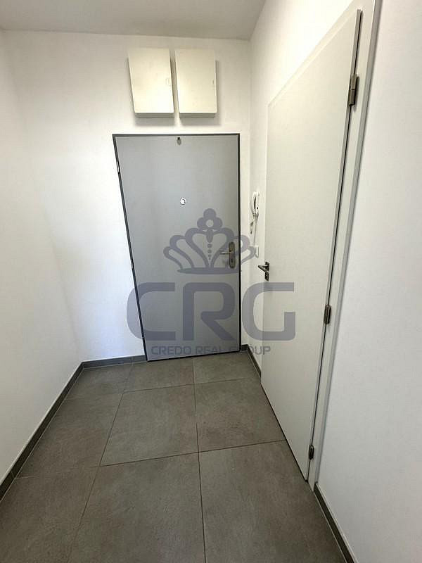 Vstupními dveřmi vejdeme do bytu a nacházíme se v chodbě o velikosti cca 3,2 m². Z této je vstup do koupelny a do hlavní obytné části s kuchyňským koutem a terasou. Koupelna o výměře cca 3,8 m² a je laděna do tmavších odstínů a je vybavena moderním sprchovým koutem, topným žebříkem, umyvadlem a WC.