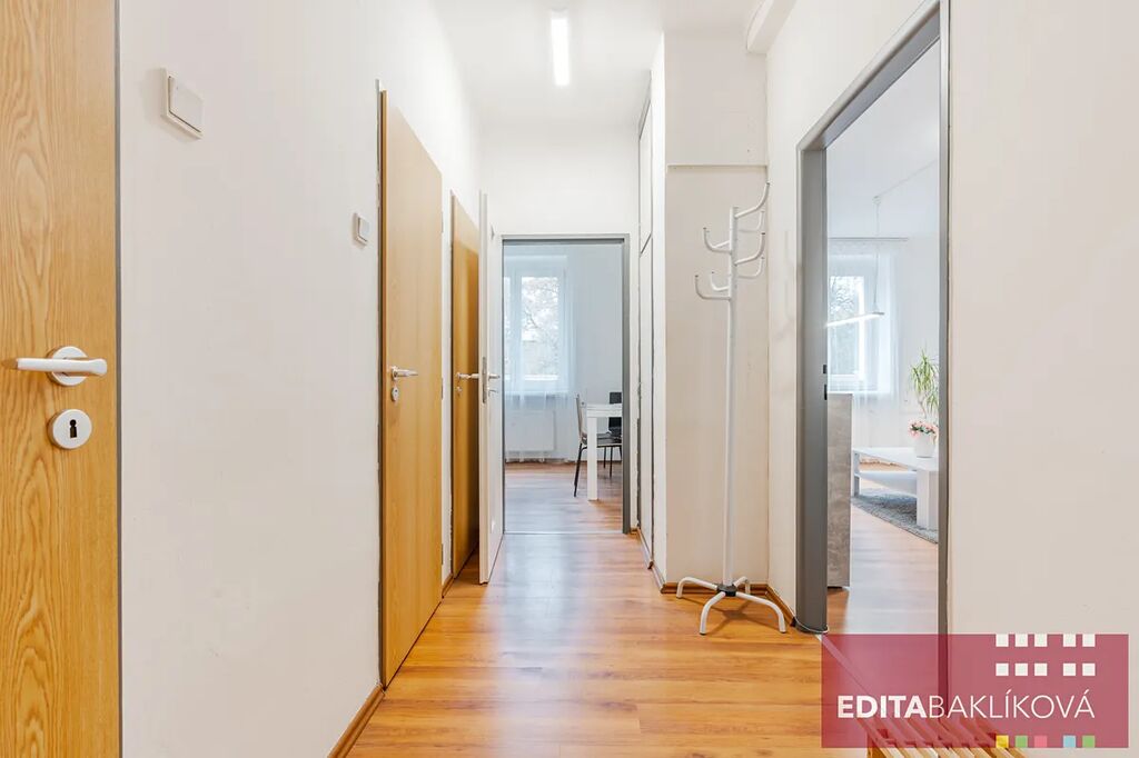Byt má velký potenciál – lze doplnit vestavěné skříně v předsíni nebo rohovou kuchyňskou linku. Ve velkém pokoji je dostatek prostoru pro spací kout (délka místnosti 6 m).