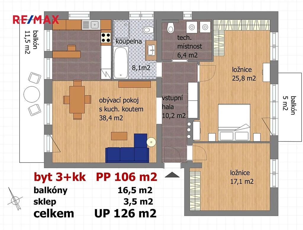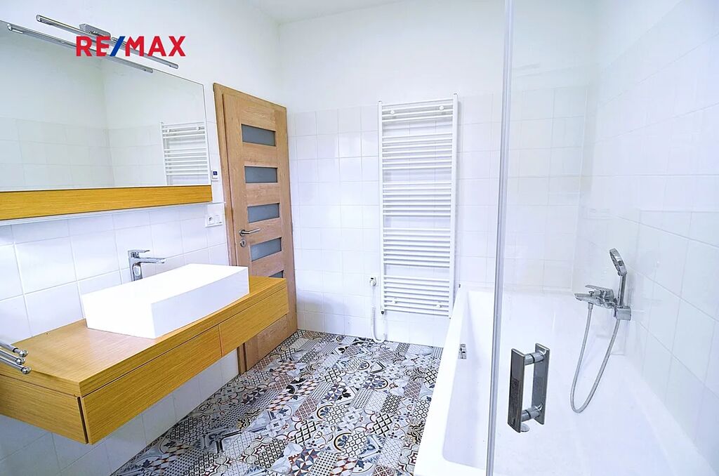 Byt se skládá ze světlého obývacího pokoje (38,4 m2) s kuchyňským koutem s mnoha okny na dvě světové strany a s výstupem na balkón o velikosti 11,5 m2. Dále z opravdu prostorné ložnice o velikosti 25,8 m2, s výstupem na druhý balkón o velikosti 5 m2. Tento pokoj lze v případě potřeby snadno přestavět vybudováním jedné příčky a přidáním dveří a vzniknou tak např. dva dětské pokoje (viz přiložené půdorysy bytu) Dále je v bytě další pokoj (17,1 m2). Ložnice jsou orientované na východ, směrem do zeleného zalesněného svahu, což poskytuje v této části bytu klid na spaní a v létě příjemný chládek. Prostorná světlá koupelna (8,1 m2) s přímým denním osvětlením je vybavena vanou, umyvadlem s koupelnovou skříňkou, WC ale také sprchovým koutem. V technické místnosti (6,4 m2) je další WC s umyvadlem a bidetovou sprškou a také elektrický bojler, pračka a sušička. Z prostorné vstupní haly je vstup do všech místností v bytě. Je zde i možnost připojení krbu nebo krbových kamen. Samotný vstup do bytu je jištěn bezpečnostními dveřmi. Na podlahách je kvalitní dřevěná podlaha z masivu a velkoformátová dlažba, v koupelně pak působivá dlažba v patchwork designu. Dveře v bytě jsou dřevěné, částečně prosklené v obložkových zárubních. Okna jsou bílá, plastová.