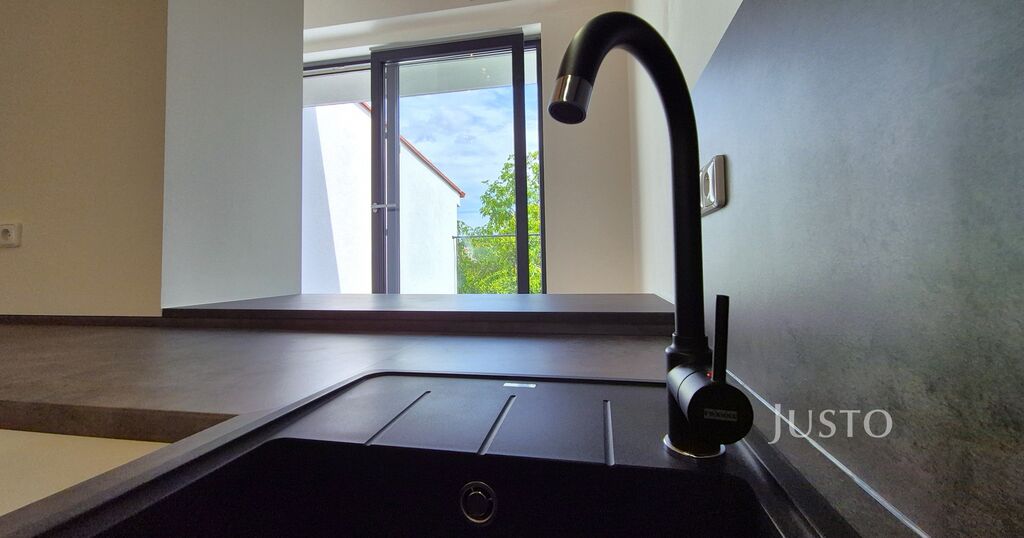 Dominantou bytu je prostorný obývací pokoj s moderní kuchyní se zvýšeným stropem a elegantním stropním osvětlením, který spolu s velkými okny zajišťuje maximální světlost a vzdušnost. Z oken i z terasy se otevírají výhledy do klidného vnitrobloku se zahradou, kterou pravidelně udržuje zahradník a je plně k dispozici obyvatelům domu.