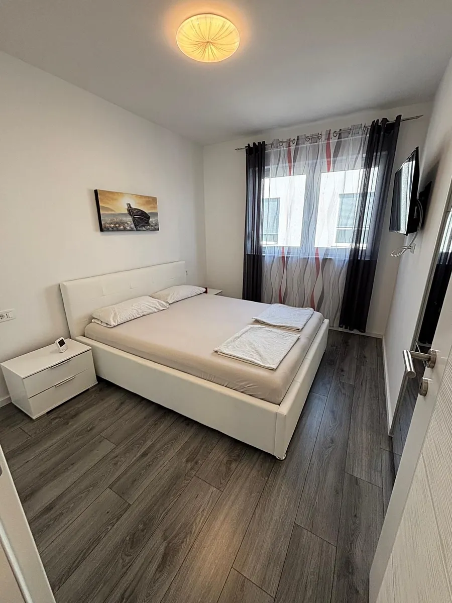 Dovolujeme si Vám nabídnout na prodej polovinu moderně postaveného rodinného dvojdomku s bazénem, upravenou zahrádkou, velkou terasou a venkovním bazénem v klidné části města Vodice v Šibenické oblasti v Chorvatsku.
