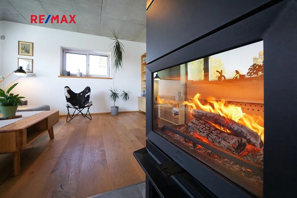 Celý interiér působí útulně a promyšleně, teplo domova zajišťuje kombinace podlahového vytápění a krbových kamen.
