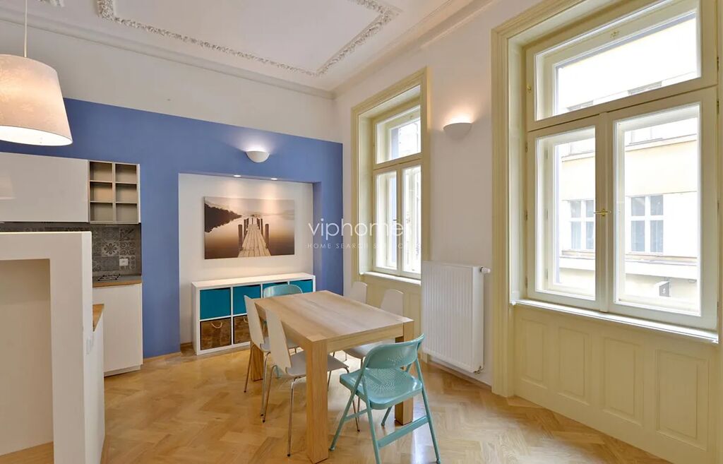 Moderně zařízený byt s balkonem ve 3. patře nově zrekonstruovaného rezidenčního projektu, v klidné ulici nedaleko Palladia, oblíbeného komplexu obchodů a restaurací. Dvě minuty chůze k nejbližšímu metru na Nám. Republiky, četné tramvajové spojení do všech částí Prahy. V pěším dosahu obchodní třída Příkopy a Václavské náměstí.