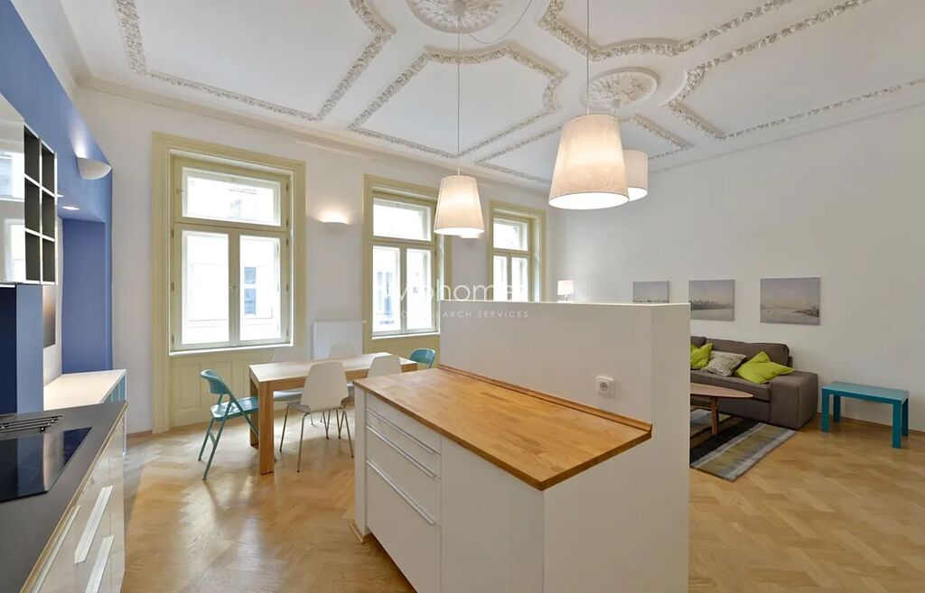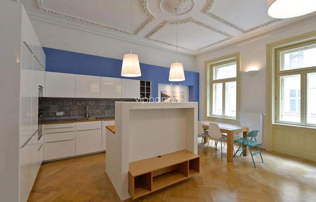 Luxusně renovovaný byt, zachované původní architektonické prvky, vysoké stropy, parkety, zatemňovací rolety a vestavěné skříně v ložnici, pračka, myčka, výtah, bezpečnostní dveře, telefonní a internetové rozvody, vybaveno novým nábytkem.