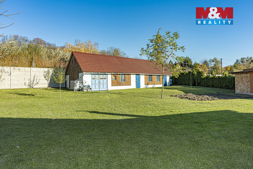 K domu náleží pozemek o rozloze 1300 m², garáž, dřevník a stodola .