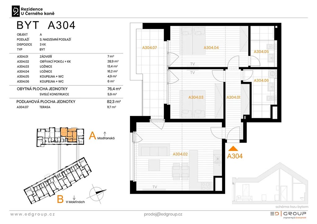 Ke každému bytu náleží sklep, který je zahrnut v ceně jednotky. Garážové stání je možné dokoupit.