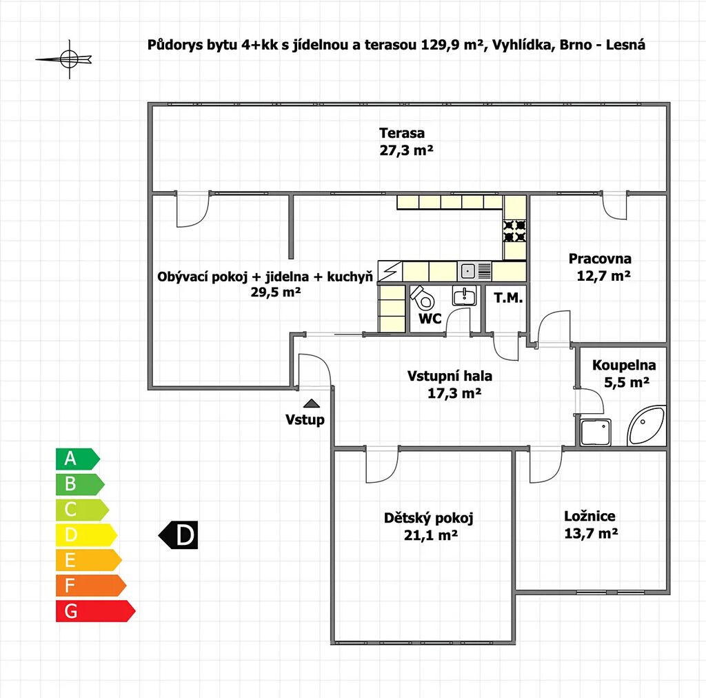 Celková užitná plocha bytu činí 129,9 m².(z toho terasa 27,3 m²)