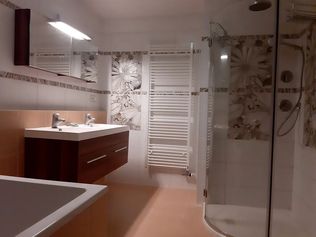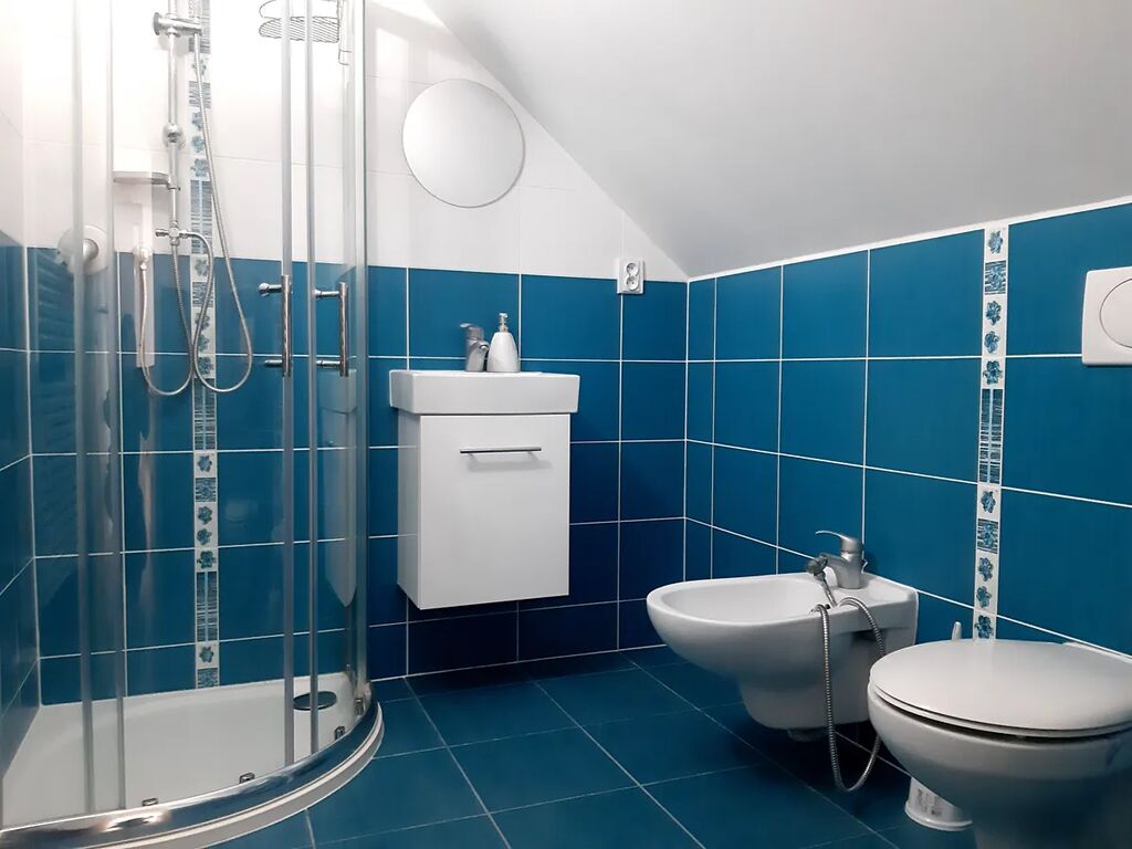 V 1.patře se nachází prostorná vybavená ložnice se samostatnou koupelnou se sprchovým koutem, dva vybavené dětské pokoje, pokoj pro hosty, pokoj, koupelna s vanou, sprchovým koutem a WC.