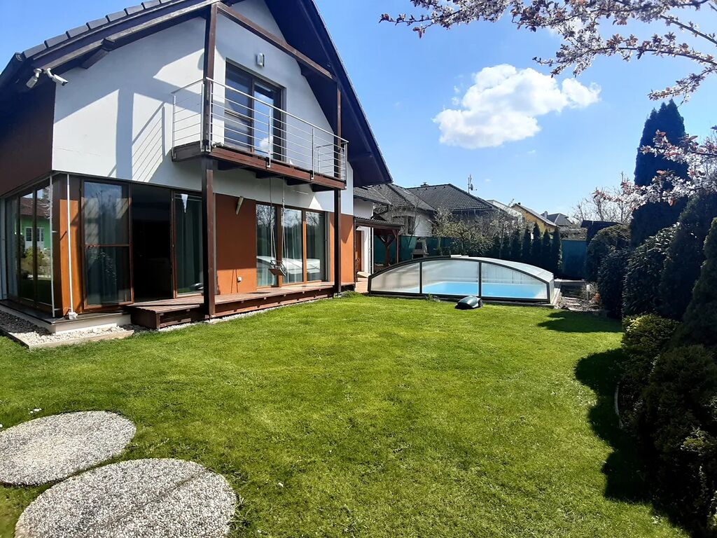 K domu náleží garáž, udržovaná zahrada, krytý bazén, venkovní krytá terasa, stání pro dva osobní automobily.