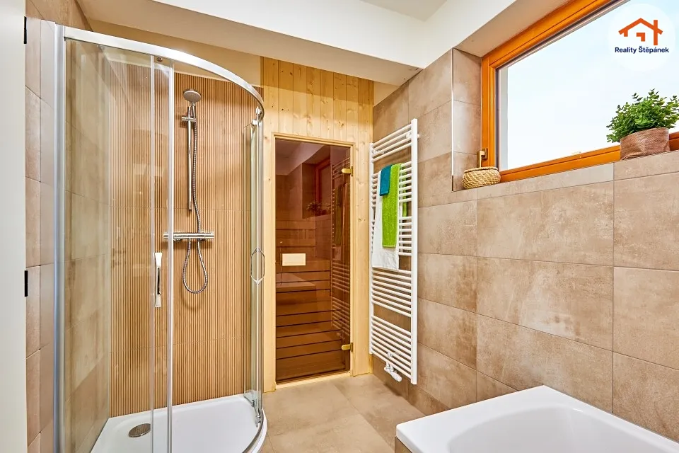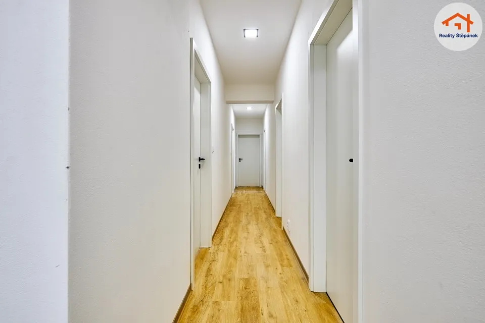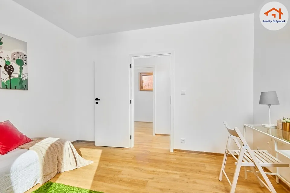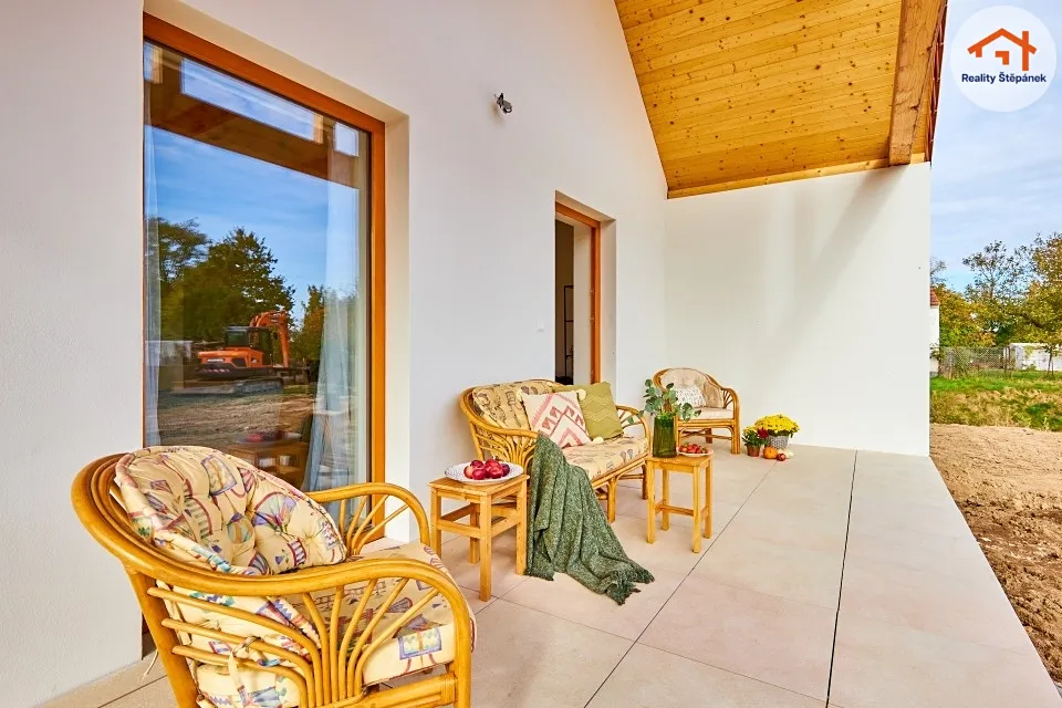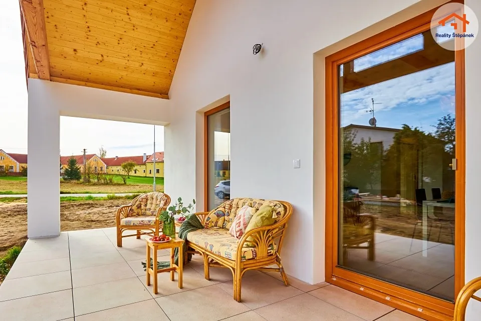 Dům tvořený jedním nadzemním podlažím nabízí obytnou plochu 115 m² s prostorným obývacím pokojem se zvýšenými stropy a odhalenými trámy, třemi ložnicemi, pracovnou, předsíní, prádelnou, technickou místností a chodbou. Z obývacího pokoje je možné vyjít na zastřešenou terasu o ploše 16,55 m² s přímým vstupem do zahrady. Dům se může dále pyšnit lepenými vinylovými podlahami, kvalitní koupelnou s broušeným obklady, nebo saunou na míru.