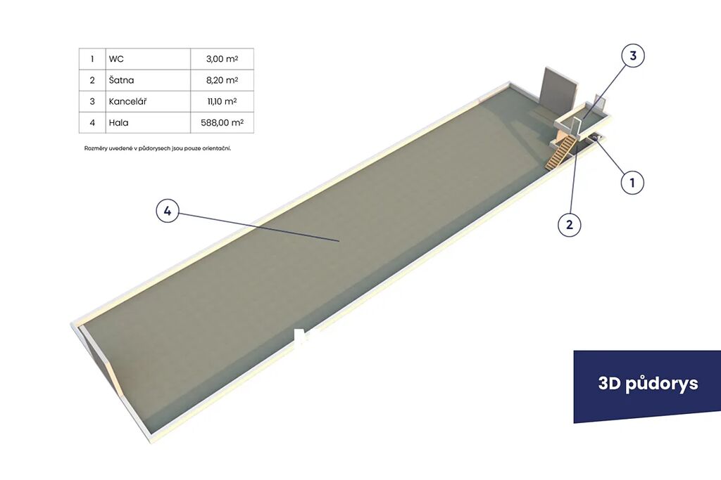 Vhodné pro skladování, showroom nebo lehkou výrobu.