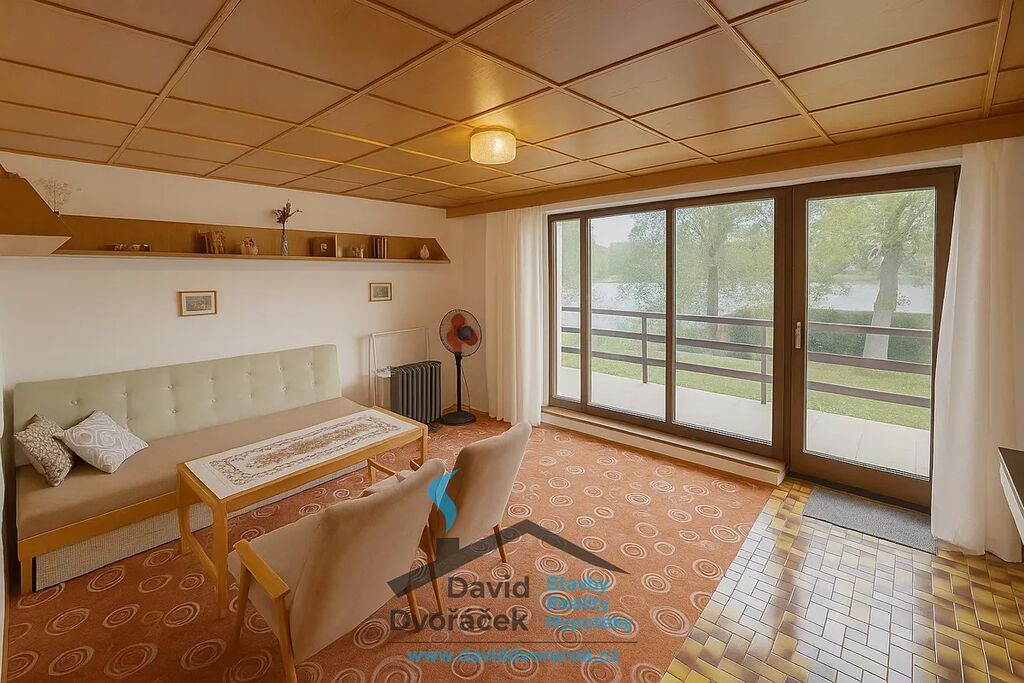 Pozemek kolem chaty je lehce svažitý, s upravenou zahradou a dostatkem soukromí. Díky své poloze zde panuje naprostý klid. Přímý přístup k vodě umožňuje pohodlné koupání, rybaření nebo jen relaxaci u vody.