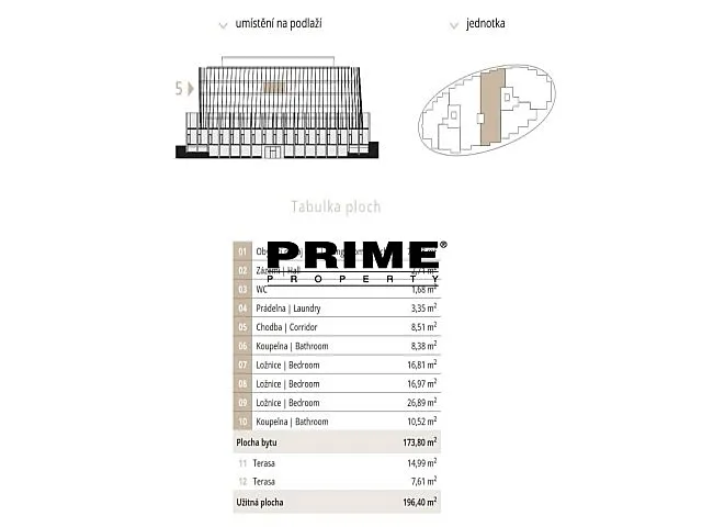 Dispozice bytu: prostorný obývací pokoj (78m2) s jídelní částí, vstupem na terasu (15m2) a s otevřenou, plně vybavenou italskou kuchyní se spotřebiči (indukční varná deska, elektrická trouba, lednice s mrazákem a myčka), hlavní velká ložnice (27m2) s vlastní koupelnou (vana, sprchový kout, umyvadlo, toaleta, bidet), další 2 ložnice (každá 17m2), druhá koupelna (vana, sprchový kout, umyvadlo, toaleta, bidet), prádelna a samostatné WC. Druhá terasa (8m2) je přístupná ze všech 3 ložnic. Dřevěné podlahy a velkoformátová dlažba. Klimatizace, rekuperace vzduchu, podlahové topení, pračka, sušička, internet přes optické vlákno, videotelefon, alarm. K dispozici je sklep 8m2.