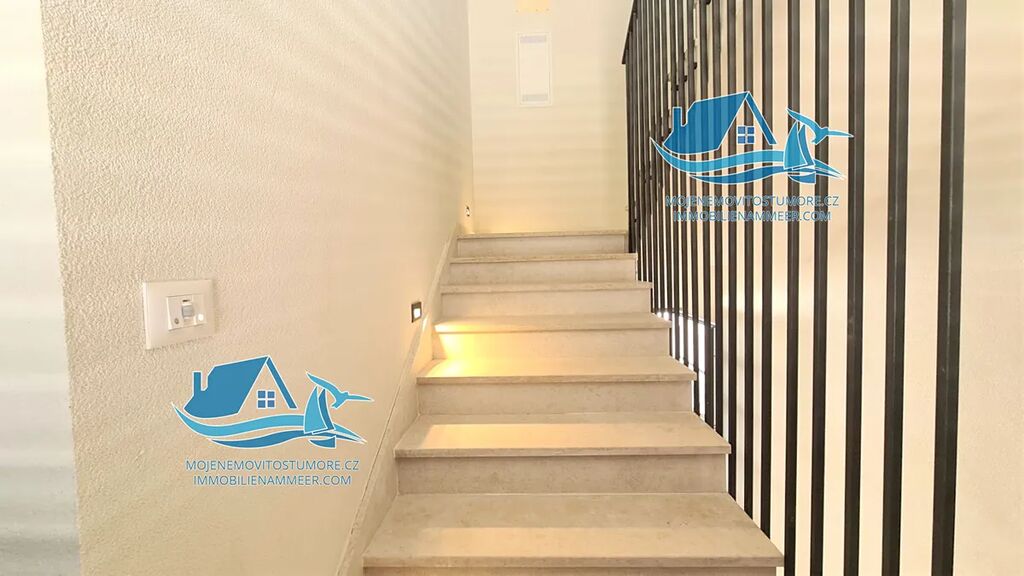 Dispozice je promyšlená a funkční. V prvním patře se nachází vstupní chodba, ložnice s vlastní koupelnou a vnitřní schodiště, které vede do horního podlaží. Druhé patro tvoří prostorný obývací pokoj s jídelnou a kuchyní, dvě ložnice, koupelna a krytý balkon ideální pro letní snídaně. Ze stejného patra vede schodiště na krovní terasu s otevřeným výhledem na moře – místo jako stvořené pro relax, grilování nebo večerní západy slunce.