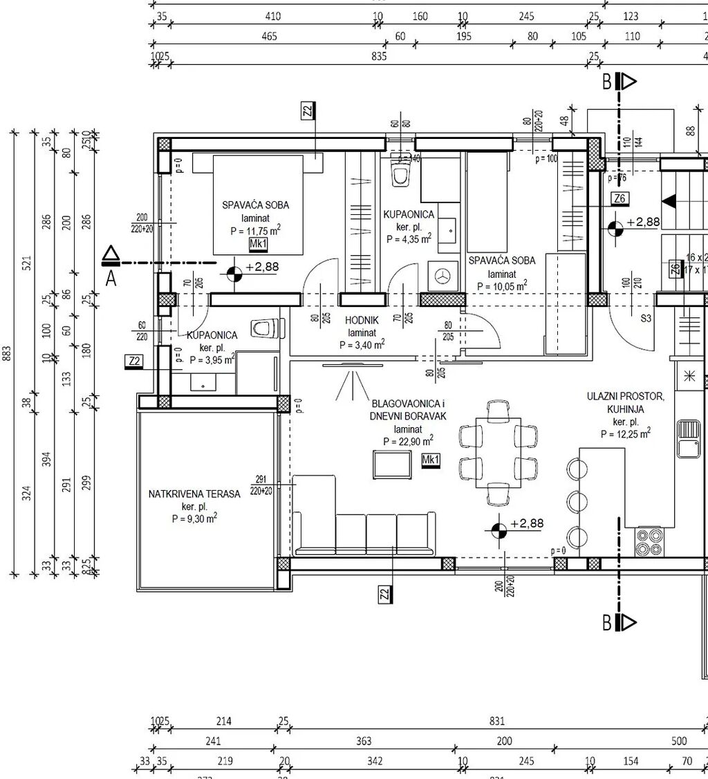 Jedná se o byt v prvním patře s dispozicí, která zahrnuje chodbu, ložnici, ložnici s vlastní koupelnou, další samostatnou koupelnu, kuchyň propojenou s jídelnou a obývacím pokojem a zastřešenou terasu. Čistá užitná plocha bytu včetně terasy činí 73,30 m2. K bytu náleží také 2 parkovací stání.