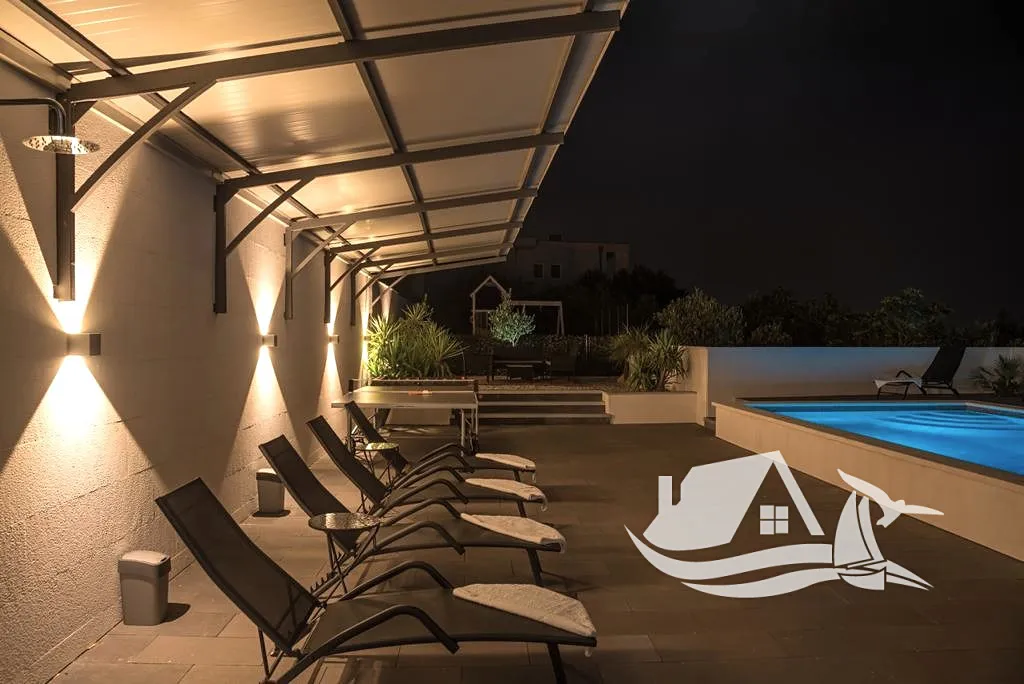 Dům je rozdělen do dvou podlaží. Přízemí nabízí příjemný výhled do zeleně olivových hájů, zatímco první patro zaujme dech beroucím pohledem na moře a ostrovy Brač, Hvar a Korčulu. Každá část domu přináší jinou atmosféru, ať už hledáte klid nebo inspiraci. Celý objekt je obklopen pečlivě udržovanou zahradou, která poskytuje nejen soukromí, ale i prostor pro život venku. Dominantou je vyhřívaný bazén se slanou vodou bez použití chloru, doplněný o dětské hřiště, moderní venkovní kuchyni s grilem a kryté posezení pro dlouhé letní večery. Součástí je i prostorný dvůr a parkovací stání pro 2 až 3 auta.