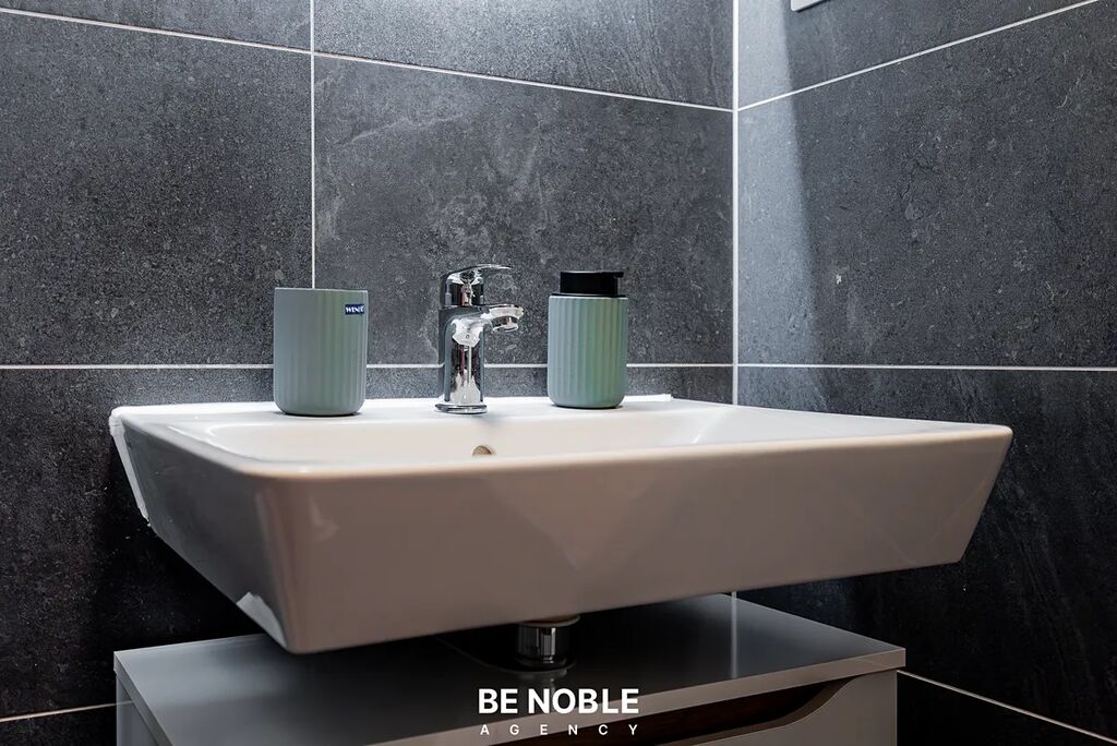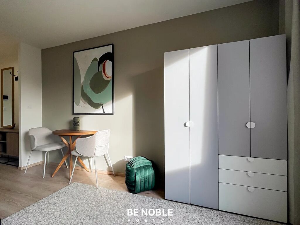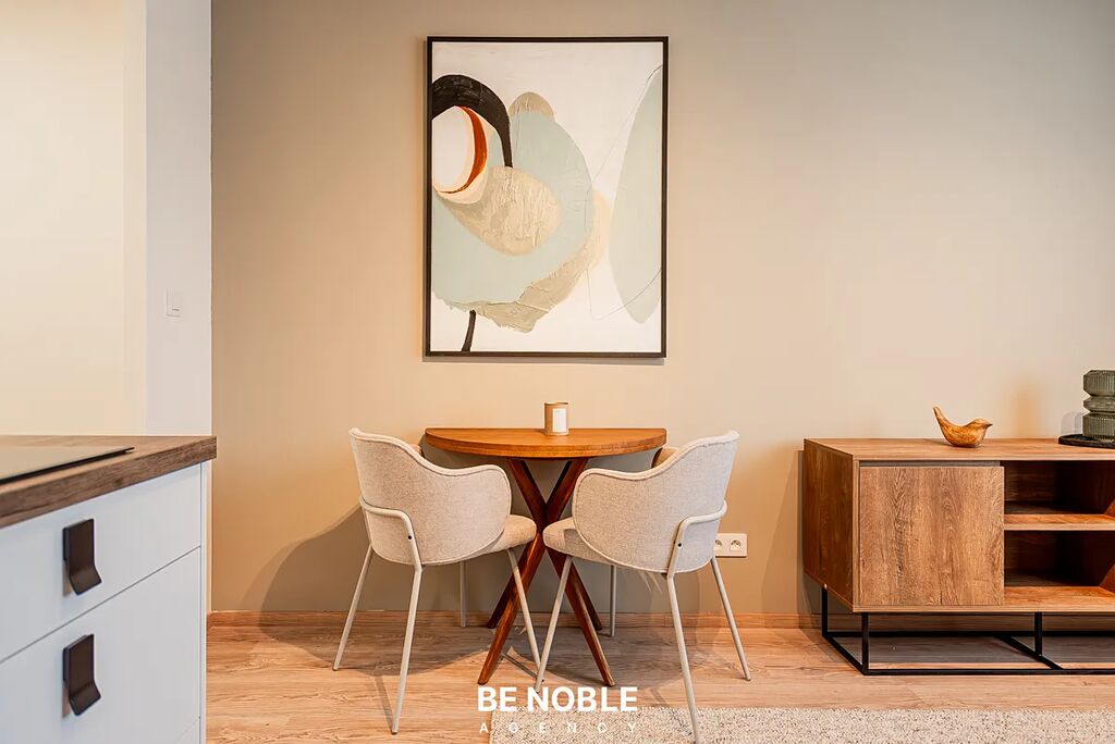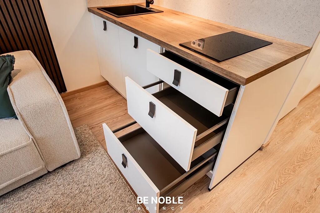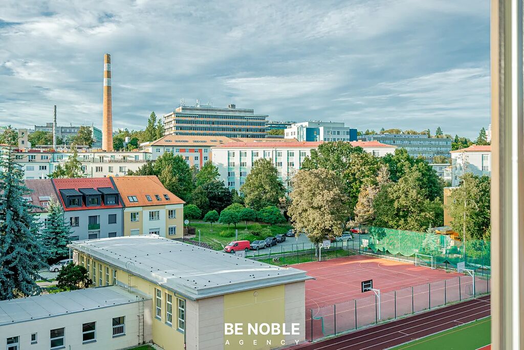 Byt byl navržen tak, aby dokonale využil každý centimetr prostoru a zároveň působil útulně i elegantně. Součástí je moderní kuchyňská linka s dostatkem úložných prostor, varnou deskou, lednicí, mikrovlnnou troubou a vestavěnou digestoří. Obytná část je vybavena kompletním nábytkem, dekorem a osvětlením od společnosti Bonami v celkové hodnotě přes 350 000 Kč – tedy nejen kuchyní, ale i pohovkou, komodou, stolem, závěsy, záclonami a designovými svítidly. Výsledkem je byt, který je připraven k okamžitému užívání nebo pronájmu – bez nutnosti dalších investic. Velké okno orientované do klidného vnitrobloku zajišťuje dostatek světla a příjemný výhled z 5. patra. V koupelně se nachází sprchový kout, toaleta a úložné prostory pod umyvadlem.