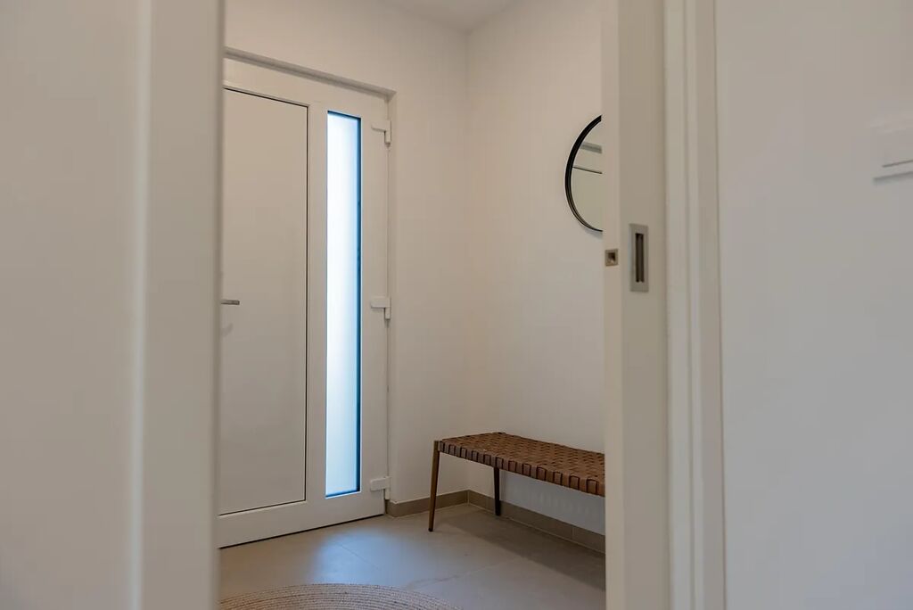 Přízemí: Chodba, menší koupelna pro hosty, větší koupelna, technická místnost, prostorný obývací pokoj s vybavenou kuchyní, přístupem na terasu a zahradu.