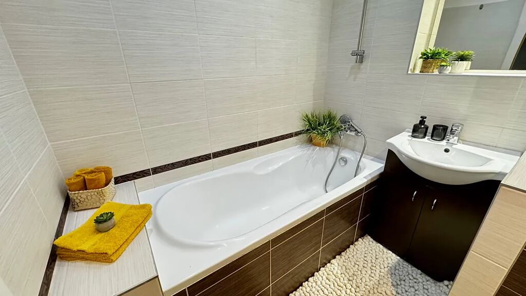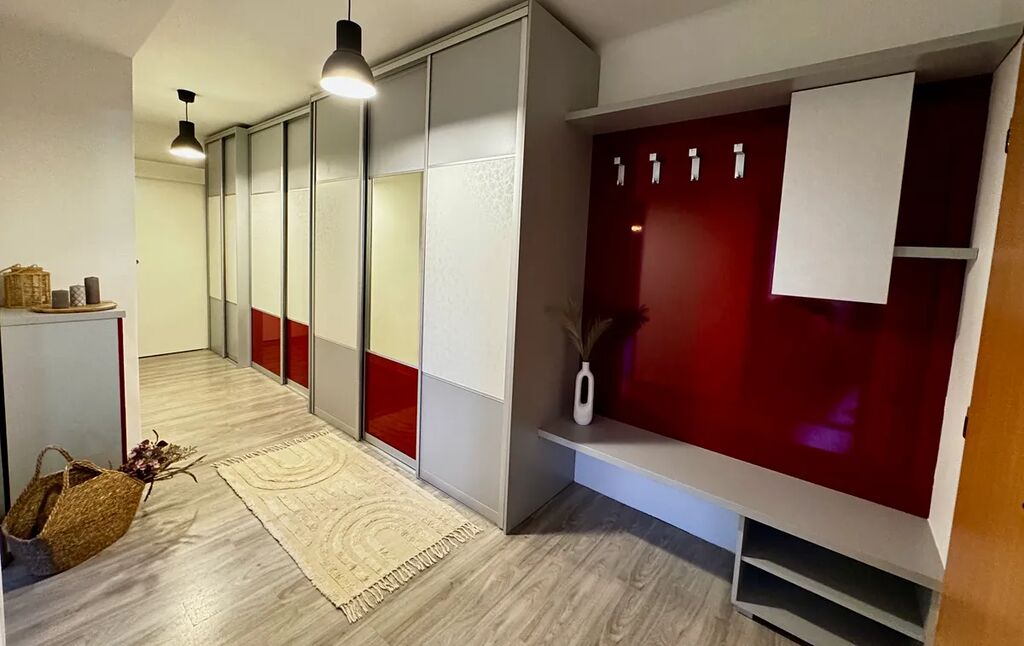 Kuchyně je vybavená, včetně jídelního stolu s židlemi. Obývací pokoj je vybavený TV stěnou, sedací soupravou, konferenčním stolkem a skříní. V ložnici je postel a nízká skříňka. V koupelně je vana, umyvadlo a WC. Vestavěná skříň v chodbě nabízí velké množství úložných prostor.