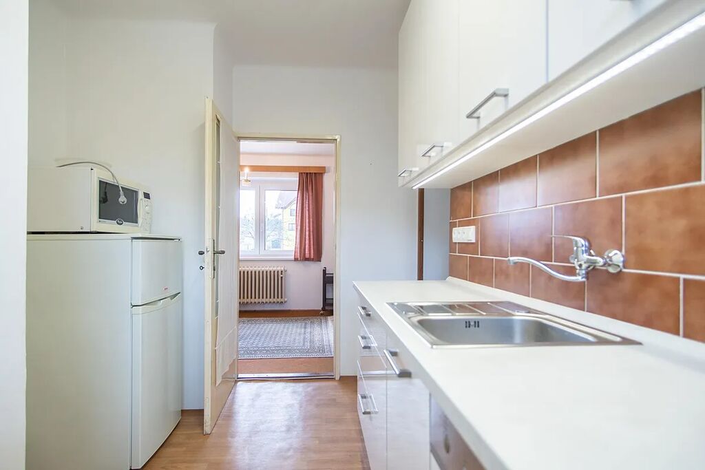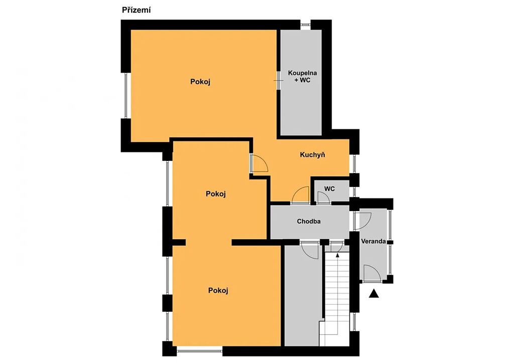 Byt 3+1 (80 m2, 3 pokoje, plně vybavená kuchyň, koupelna se sprchou a WC, samostatné WC, vestavěná skříň) se nachází ve zvýšeném přízemí.