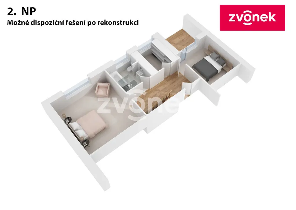 Pro lepší představu o možné finální podobě domu po dokončení rekonstrukce najdete v galerii nabídky vizualizace exteriéru, interiéru a 3D půdorysy obou podlaží.
