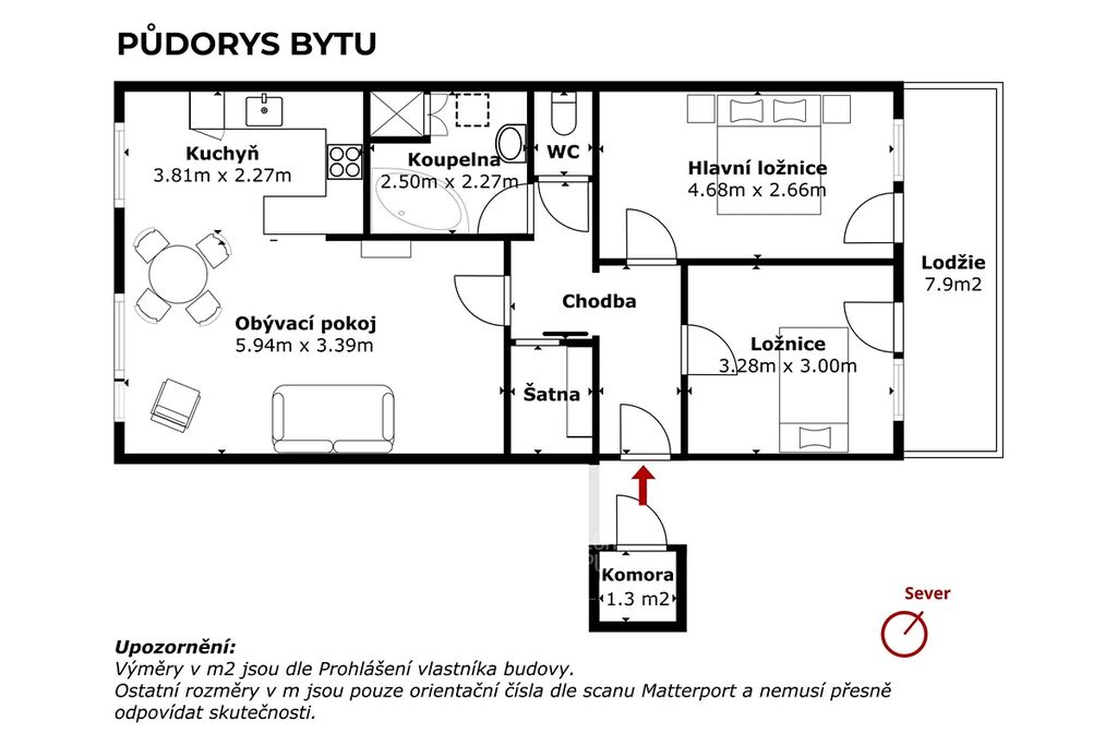 Na prodej je byt 3+kk o podlahové ploše 72 m2 + komora 1.3 m2 + lodžie 7.9 m2.