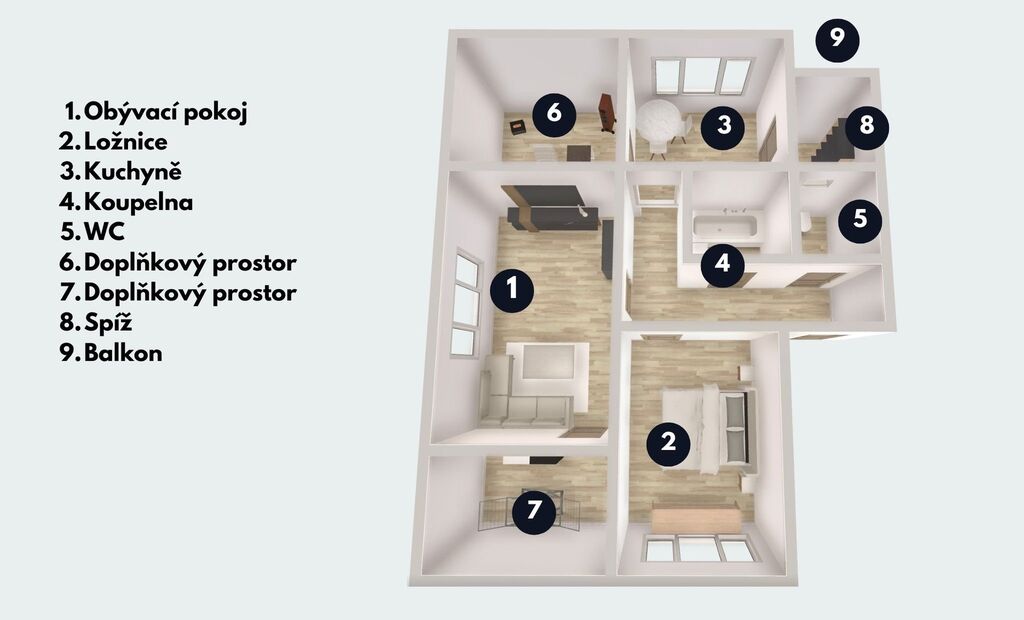 Po vstupu do bytu vás přivítá prostorná chodba, odkud se pohodlně dostanete do všech místností. Kuchyně se spíží a vstupem na balkon je ideální pro ranní kávu i večerní posezení. Obývací pokoj nabízí dostatek prostoru pro společné chvíle, ložnice zase klid a soukromí. Dvě menší místnosti navíc můžete využít jako šatnu, pracovnu nebo dětský koutek – podle toho, co zrovna nejvíc potřebujete. Koupelna je oddělená od samostatného WC, což ocení zejména rodiny.